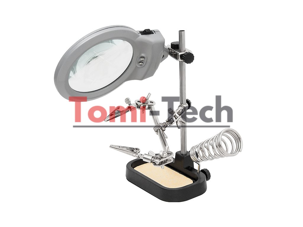 Dizajn z tretej ruky umožňuje nielen montáž prvkov, s ktorými budeme pracovať, ale aj dodatočné priblíženie a osvetlenie pracovnej oblasti. Slúži tiež ako stabilná základňa pre spájkovačku a vďaka špongii môžete spájkovací hrot kedykoľvek vyčistiť.