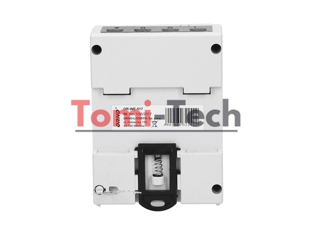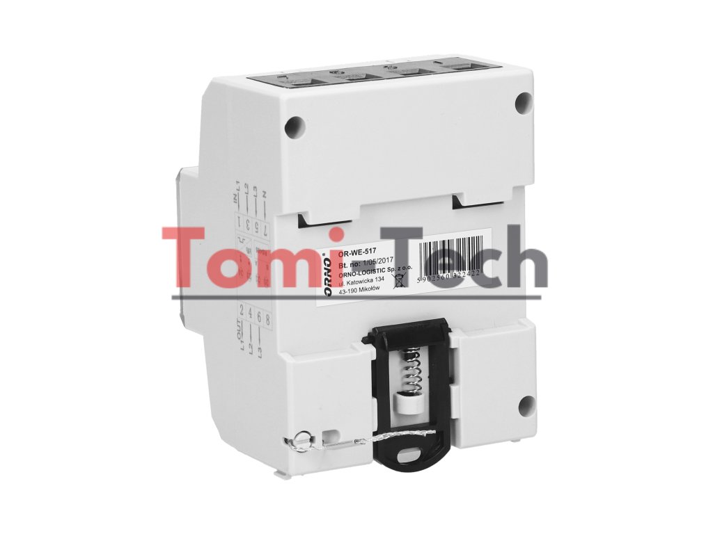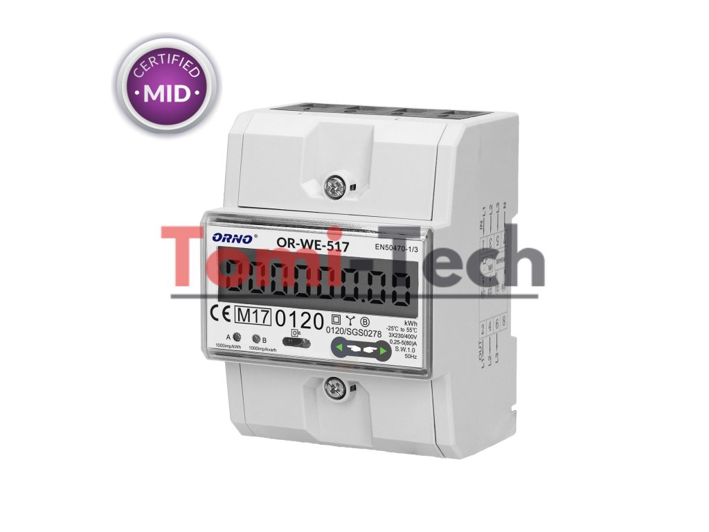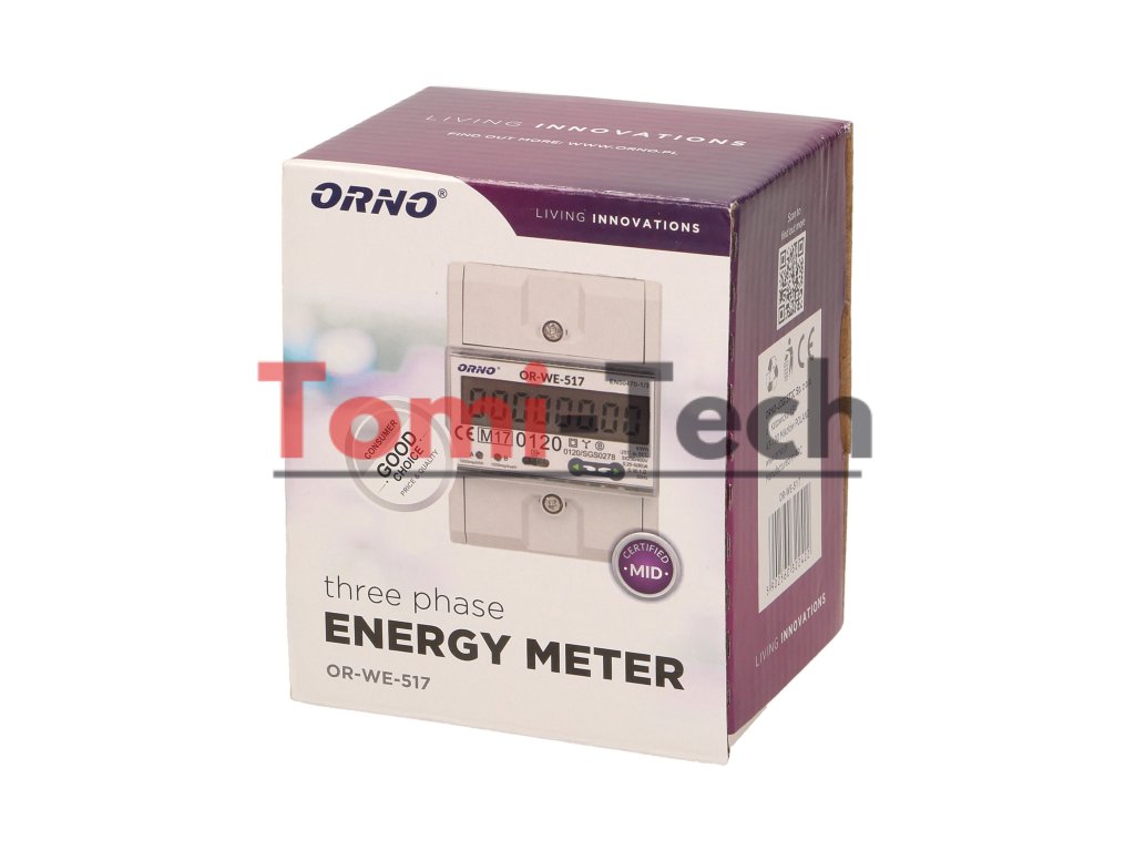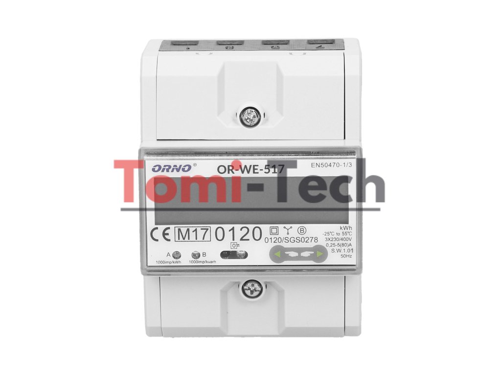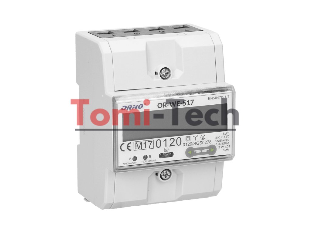 Toto zariadenie, ktoré meria hodnoty v metrických jednotkách (kWh), slúži na priame meranie činného výkonu v trojfázovom systéme a zaznamenávanie spotrebovanej elektriny s možnosťou diaľkového odčítania registrov skupiny indikátorov cez káblovú sieť RS485. Protokol: Modbus-RTU a 4 nezávislé tarify (používateľ si môže nastaviť rôzne časy cez port RS485). Vybavené IR optickým portom – spolupracuje s optickou hlavicou OR-WE-518. Špeciálny elektronický obvod pod vplyvom pretekajúceho prúdu a priloženého napätia generuje impulzy úmerné spotrebovanej elektrickej energii. Spotreba energie vo fáze je signalizovaná blikajúcou LED diódou. Počet impulzov sa prepočítava na spotrebovanú energiu a jeho hodnota sa zobrazuje na LCD (6+2) displeji. Napájanie: 230V~, 50Hz, základný prúd: 5A, max. prúd: 80A, min. prúd: 0,25A, frekvencia impulzov: 1000 impulzov/kWh, trieda presnosti B, trojmodulové puzdro, montáž na DIN lištu TH-35 mm. Meranie energie sa vykonáva v súlade s normami EN50470-1:2006, EN50470-3:2006 smernice MID 2014/32/EÚ.Dodatočné parametre