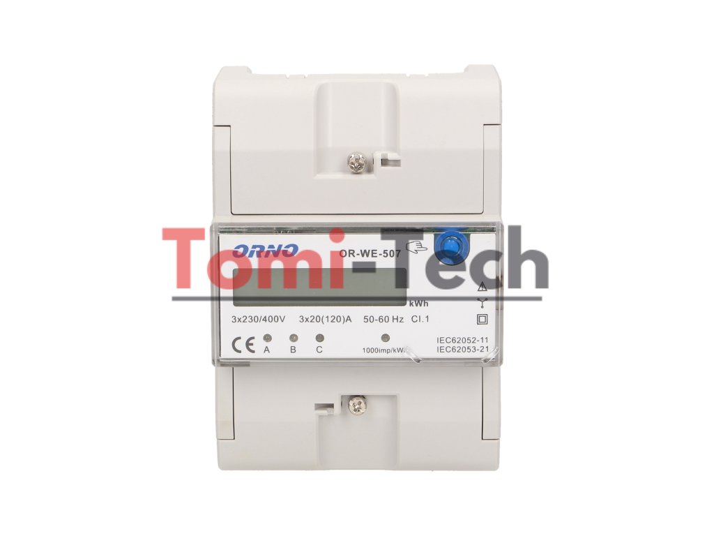 Toto zariadenie, ktoré meria činný výkon v metrických jednotkách (kWh), sa používa na priame meranie činného výkonu v trojfázovom systéme. Pod vplyvom pretekajúceho prúdu a aplikovaného napätia v každej fáze zobrazuje špeciálny elektronický obvod impulzy úmerné elektrickej energii spotrebovanej v danej fáze. Spotreba energie vo fáze je signalizovaná blikajúcou LED diódou. Súčet impulzov z troch fáz sa prepočíta na energiu spotrebovanú v celom trojfázovom systéme a jeho hodnota sa zobrazuje na LCD displeji (6+1 číslic). Napájanie: 3 × 230V~, 50Hz, základný prúd: 20A, maximálny prúd: 120A, frekvencia impulzov: 1000 impulzov/kWh, prídavné tlačidlo: vynulovanie špičkovej spotreby energie meracieho systému za posledných 30 minút po zapnutí záťaže, presnosť merania: trieda 1, montáž na 35 mm lištu.Dodatočné parametre