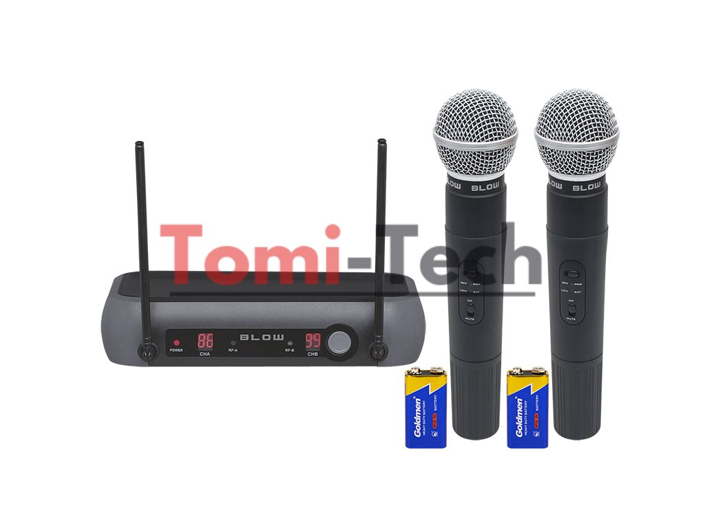 Profesionálna, vysoko kvalitná sada pozostávajúca z dvoch bezdrôtových mikrofónov a prijímača od spoločnosti Blow, určená pre profesionálne aj amatérske použitie. Pripojenie a používanie by nemalo predstavovať žiadne väčšie problémy. Maximálny dosah medzi prijímačom a mikrofónom je 50 metrov.