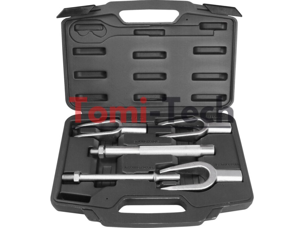 Táto sada sťahovákov na čapy alebo sťahovákov na ťahadlá riadenia je vyrobená z pochrómovanej uhlíkovej ocele. Sťahováky na čapy sú určené na použitie s pneumatickým alebo ručným kladivom a vidlicové ramená v sťahovákoch majú tvrdé, rovnomerné klinovité povrchy, ktoré umožňujú jednoduché a presné uvoľnenie zaseknutých čapov a ťahadiel riadenia. Tieto sťahováky na čapy skracujú pracovný čas v autoservisoch a garážach, čo umožňuje servis osobných automobilov a dodávok, európskych, amerických aj japonských.