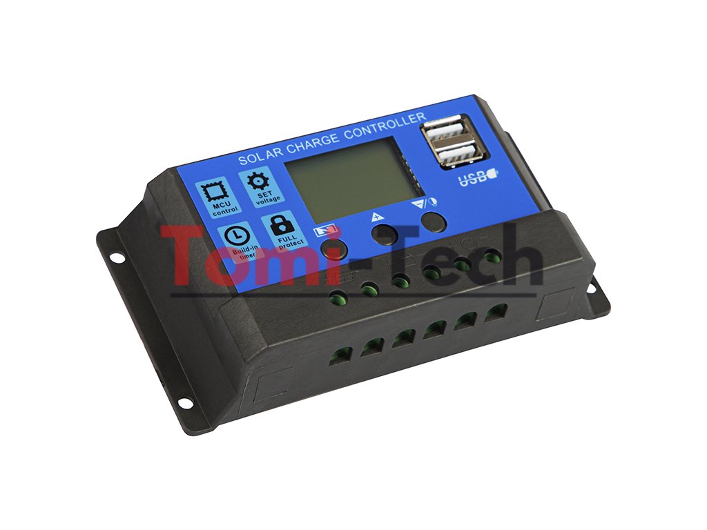Regulátor nabíjania pre solárne panely. Premieňa energiu generovanú fotovoltaickými panelmi na batériu. Umožňuje PWM riadenie nabíjania. Jednoduchá inštalácia a obsluha (fyzické tlačidlá). Podsvietený LCD displej umožňuje sledovanie nastavených parametrov v reálnom čase. Má časovač, ktorý umožňuje nastaviť nočné osvetlenie.