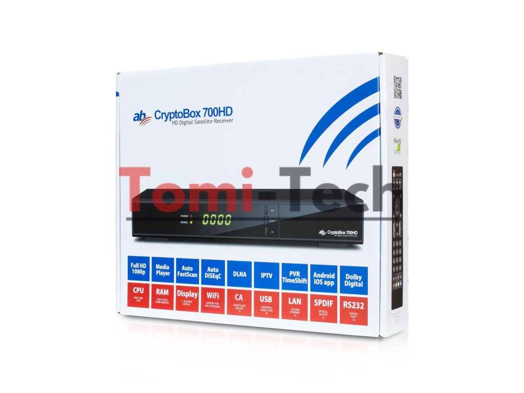 Nástupca najúspešnejšej rady satelitných prijímačov CryptoBox 6XX od spoločnosti AB. Kombinácia digitálneho satelitného prijímača a prehrávača médií v rozlíšení Full HD 1080p. Sledujte HD programy, živé vysielanie na zariadeniach so systémom iOS a Android a pristupujte k multimediálnym videám, fotografiám a hudbe. Nahrávajte programy v reálnom čase. Jednoduché nahrávanie podľa času pomocou EPG alebo sprievodcu TIMESHIFT s časovým posunom v nahrávaní. Panel X-tras s mnohými funkciami: množstvo hier, FTP Downloader, predpoveď počasia, prehliadač RSS správ a mnoho ďalších aplikácií. FTP Downloader na zálohovanie, obnovu a prenos súborov z USB na FTP alebo z FTP na USB (nastavenia, firmvér, videá, MP3 atď.). Ak prijímač po aktualizácii vyžaduje UNI PIN, zadajte 0852. Vďaka jednoduchej inštalácii a novej funkcii All Scan môže satelitný prijímač pripraviť na použitie ktokoľvek. Po výbere jazyka a vložení karty funkcia All Scan naladí prijímač na základe typu vloženej prístupovej karty.