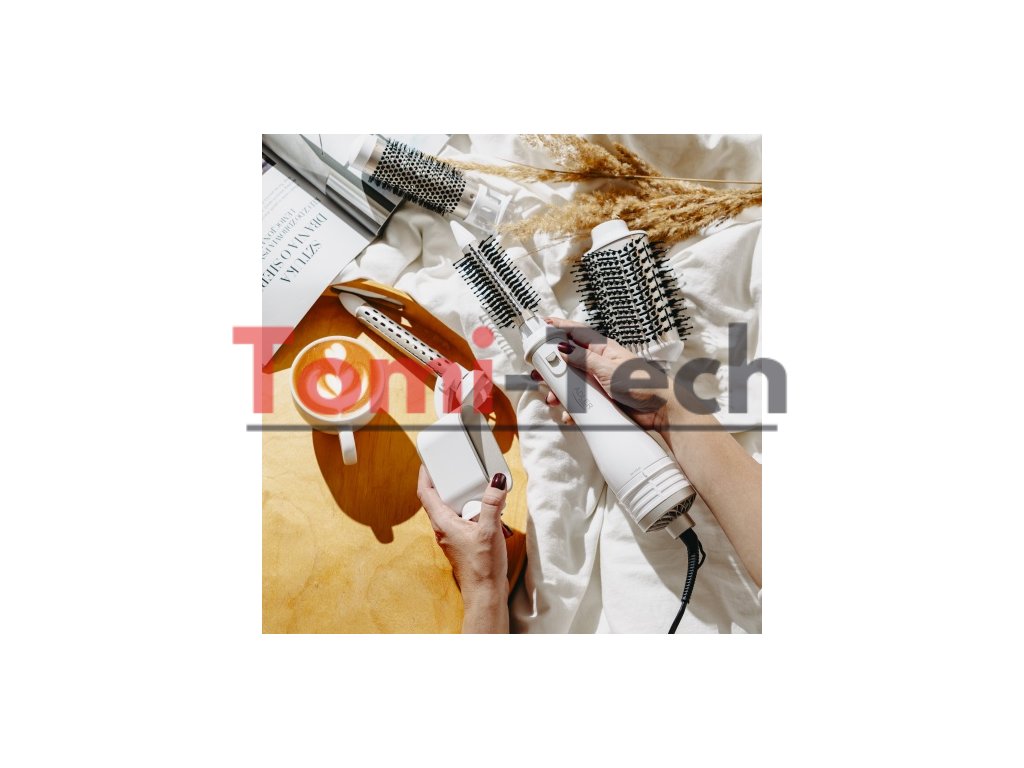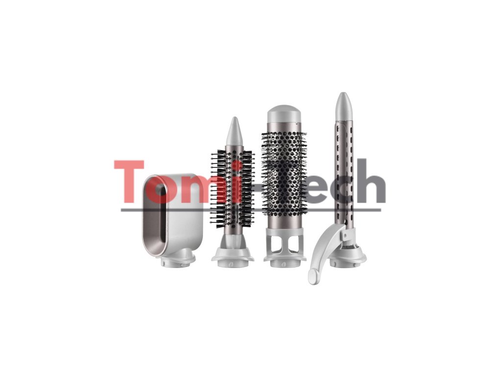 - 5 vymeniteľných nástavcov: Sada obsahuje dve okrúhle kefy s priemerom 21 mm a 38 mm, veľkú kefu s priemerom 72 mm, kulmu s priemerom 19 mm a nadstavec na fén, aby sa nástroj prispôsobil každej úlohe.