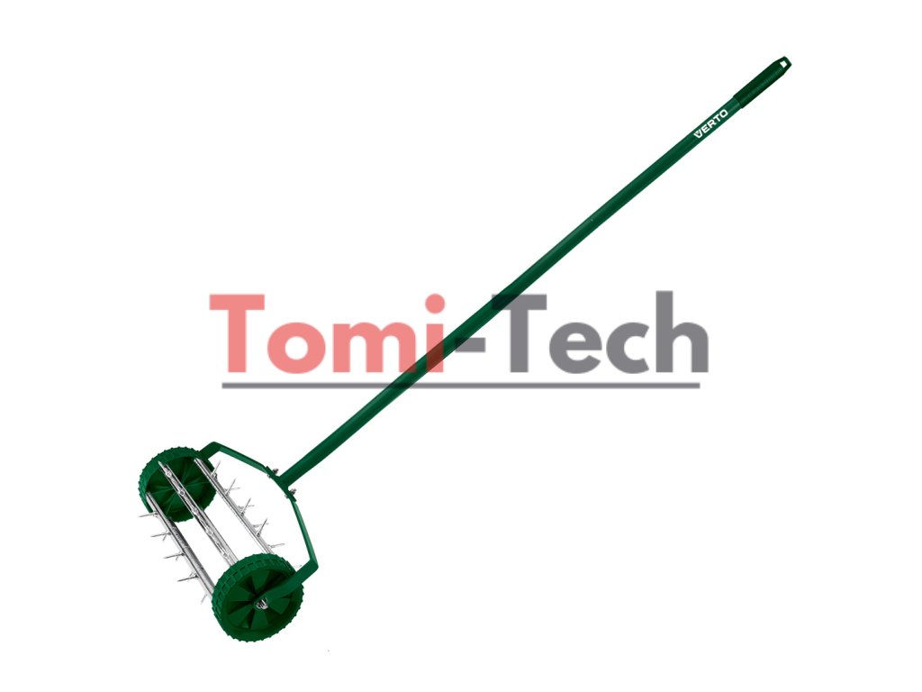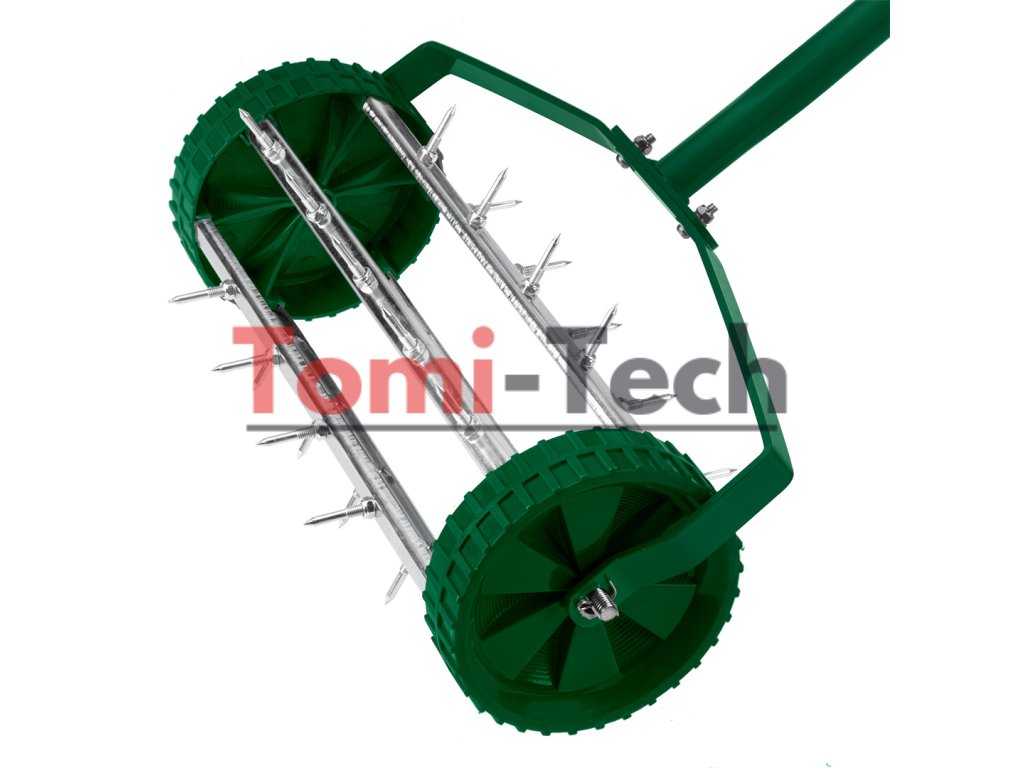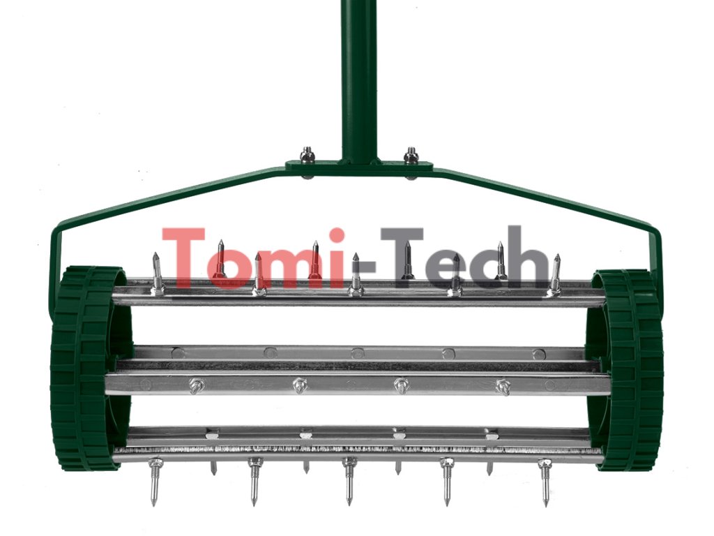 Ručný prevzdušňovač, valcový vertikutátor trávy 27 hrotov, priemer valca 15 cm, šírka valca 42 cm, celková šírka 44 cm, skrutkovaná kovová rukoväť, závitové spoje, dĺžka rukoväte 112 cm, priemer rukoväte 2,5 cm, celková dĺžka 137 cm, celková hmotnosť 3,75 kg, prášková farba, PP kolieska, oceľová konštrukcia, dĺžka jedného hrotu 3,5 cm.Dodatočné parametre