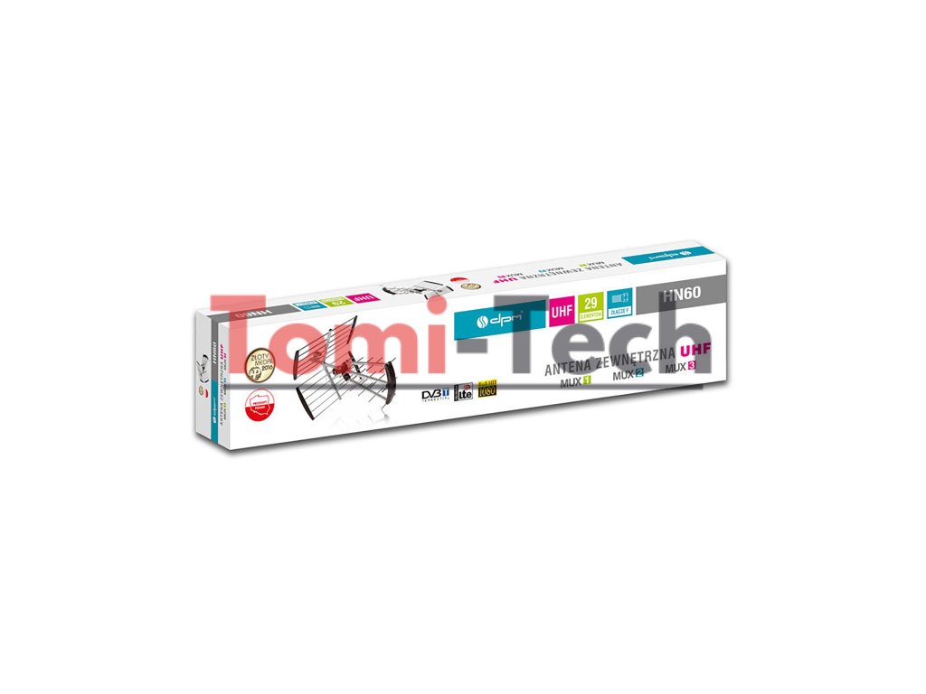 ----------Technické špecifikácie-----------Prijímacie pásmo: UHFLTE Filter: ÁnoOblasť použitia: VonkajšieMateriál: HliníkPolarizácia: Vertikálna a horizontálnaFarba: Sivá----------Vlastnosti----------Táto vonkajšia TV anténa prijíma digitálnu televíziu DVB-T v pásmach UHF (frekvencia 470-790 MHz). Je vybavená LTE filtrom, ktorý blokuje rušenie z pásma LTE a má balun. Je vyrobená z hliníka a skladá sa z 29 prvkov. Ľahká a odolná konštrukcia je odolná voči nepriaznivým poveternostným podmienkam. Anténa nevyžaduje napájanie, stačí ju pripojiť k televízoru. Prijíma kanály 21-60 (v pásme UHF). Anténa je polarizovaná vertikálne aj horizontálne. S touto anténou môžete sledovať svoje obľúbené programy v kvalite Full HD 1080p. ----------Inštalácia antény----------Anténa HN60 je zostavená z 29 prvkov. Montáž je rýchla a jednoduchá; možno ju zostaviť bez náradia. Zostavená anténa sa namontuje na vonkajší anténny stožiar. Montážny držiak na stožiar je súčasťou súpravy.Dodatočné parametre