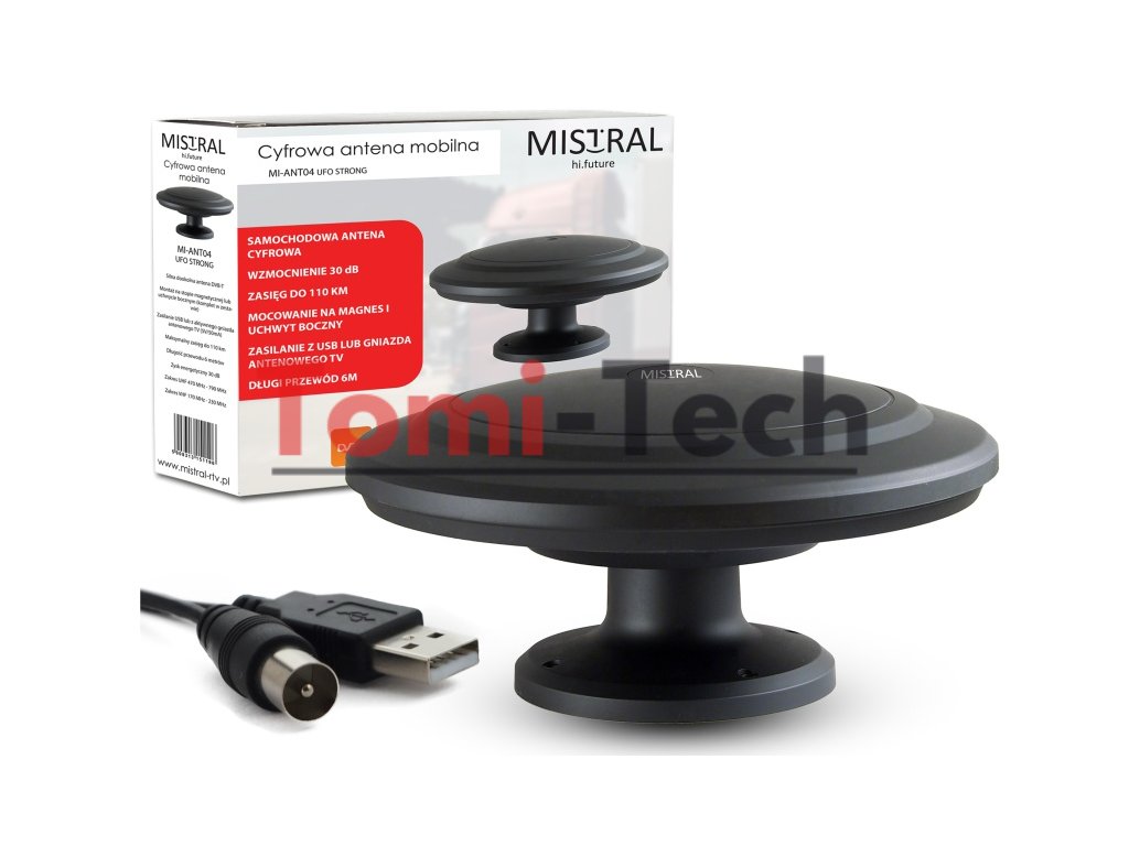 Rozsah UHF: 470 MHz - 790 MHz Rozsah VHF: 170 MHz - 230 MHz Spotreba prúdu: 10-20 mA Zisk: 30 dB Šumové číslo: <2 dB Napájanie: 5 V, anténa Orientácia: 360 stupňov Montáž: Magnetický držiak alebo bočný držiak Dĺžka kábla: 6 m Priemer: 30 cm Výška: 15 cm Obsah balenia: Anténa Magnetický držiak Bočný držiak Upevňovacie prvky pre bočný držiak Kábel (6 metrov) Oddeľovač napätia Napájací USB kábelDodatočné parametre