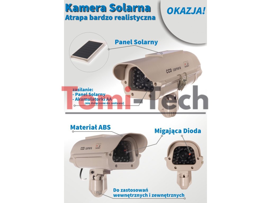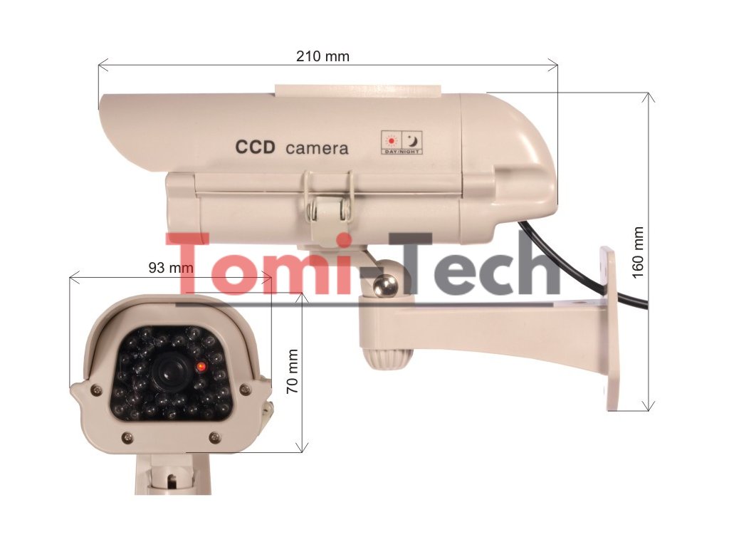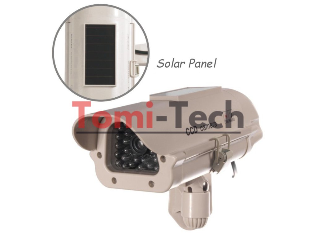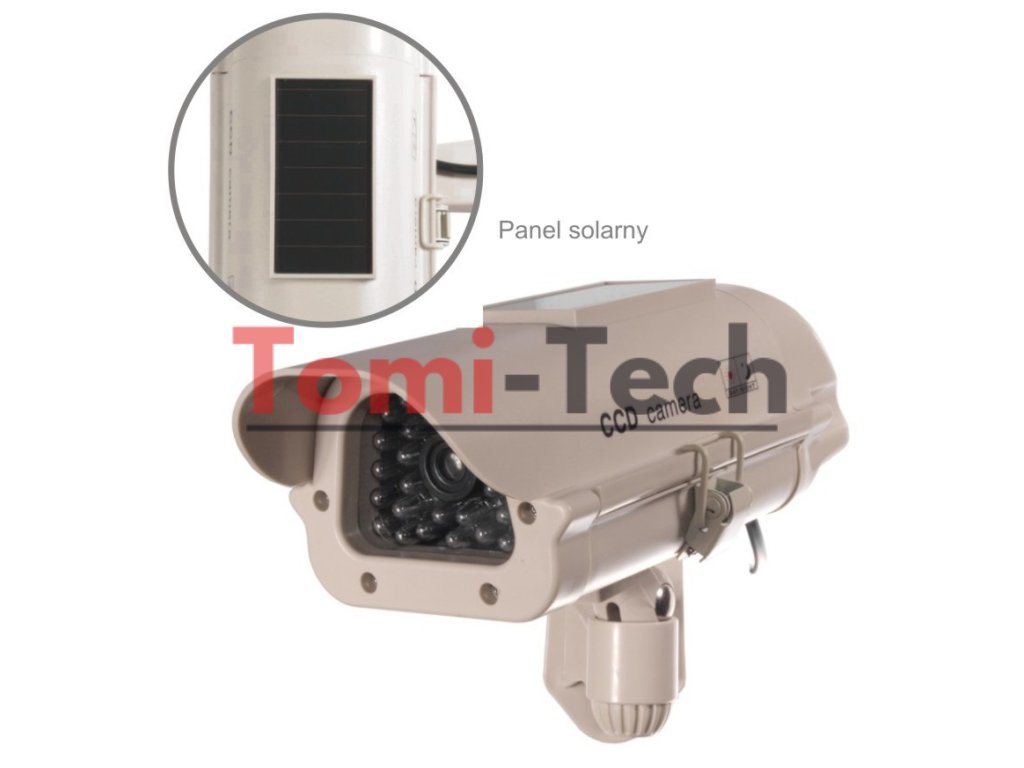 Veľmi verná kópia originálnej kamery s imitáciou IR LED diód a červenou LED diódou. Jej spracovanie sa vyznačuje vysoko kvalitnými materiálmi a dôrazom na detail. Celá vec vyzerá veľmi realisticky; ani skúsený inštalatér kamery nerozozná rozdiel medzi skutočnou kamerou a figurínou. Vďaka solárnemu panelu sa nemusíte obávať batérií, pretože ich panel bude denne nabíjať.