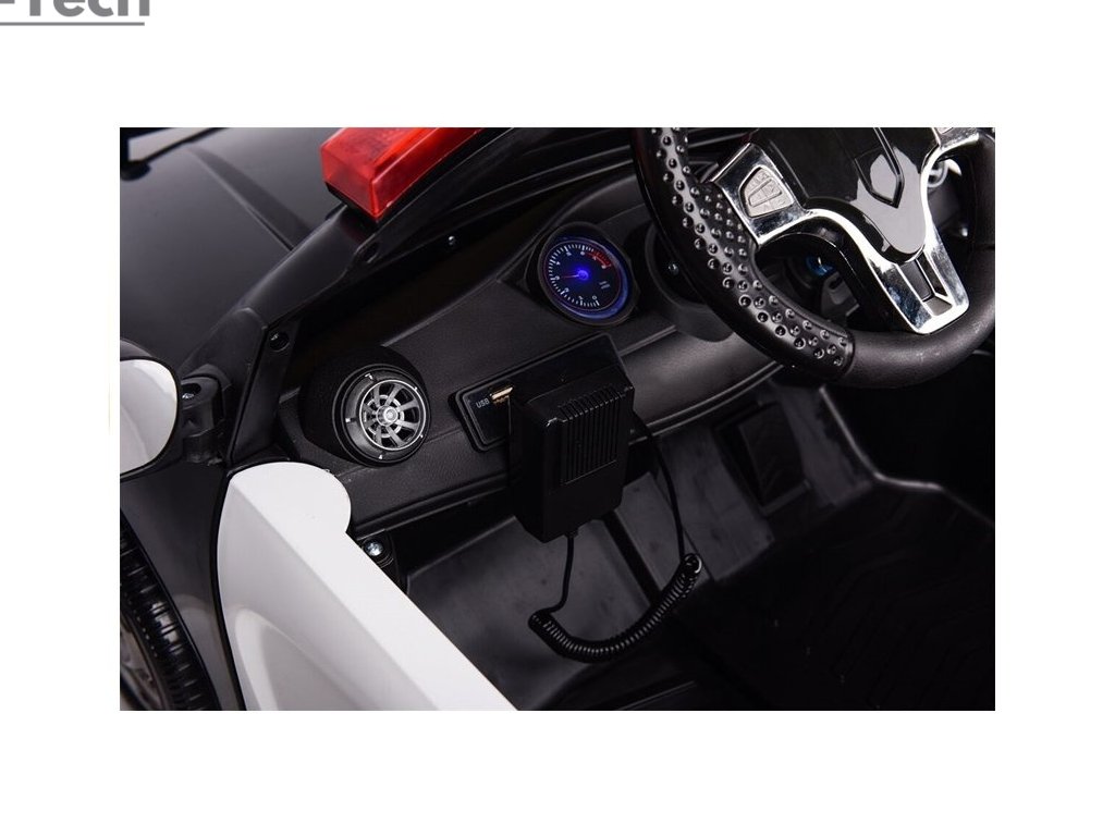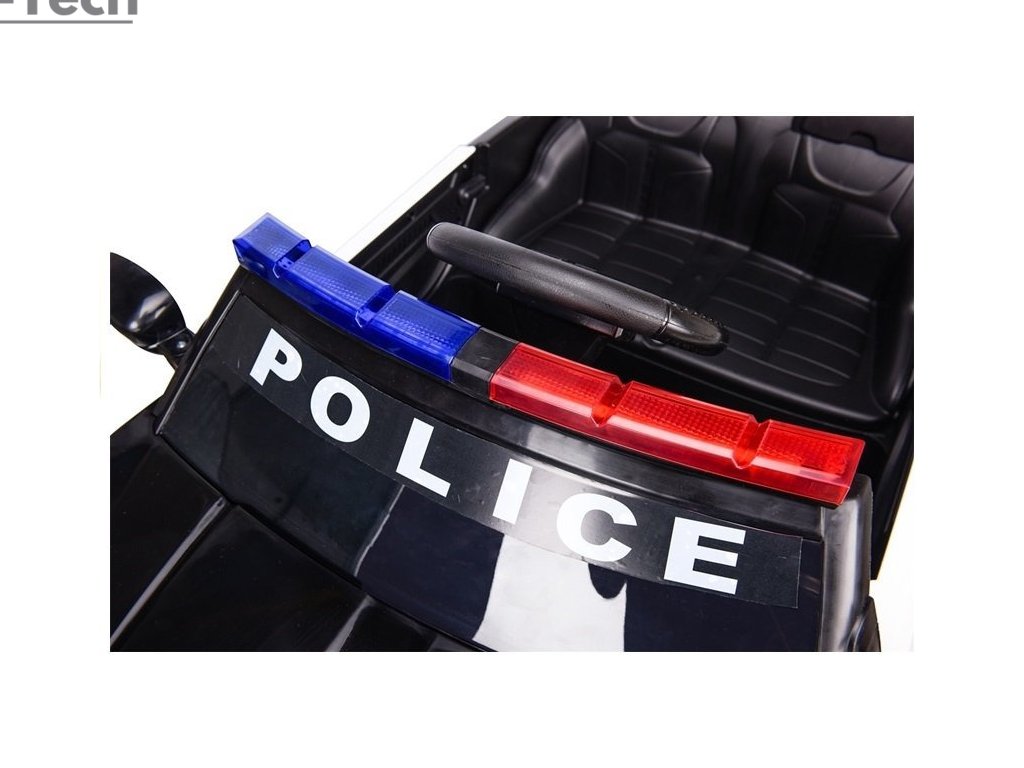 Zaujíma vás, čo robí toto policajné auto nielen skvelým, ale zaručuje aj rovnako vysokú úroveň zábavy? Poháňa ho dvojitý motor s výkonom 2x35 W, ktorý v kombinácii s batériou s výkonom 12 V (12V4) a výkonom 5 Ah umožňuje jazdu rýchlosťou 3 až 5 km/h. To nie je všetko. Za zmienku stojí, že verzia detského policajného auta na batérie je vybavená automatickou prevodovkou s 3-stupňovou reguláciou rýchlosti. Vo vnútri tmavej verzie detského policajného auta sa nachádza pohodlné sedadlo vyrobené z ekokože, ako aj ergonomicky tvarovaný volant, ktorého rozmery boli prispôsobené rozmerom rúk malých detí. Ďalšou veľkou výhodou je určite modro podsvietená palubná doska, ktorá obsahuje imitácie dôležitých ukazovateľov a hodín, ako je rýchlomer a otáčkomer. V druhej časti kokpitu sa nachádza audio panel, ktorý umožňuje príjemné cestovanie s vašimi obľúbenými melódiami na pozadí. Dizajn hudobného prehrávača zahŕňa porty MP3, USB a TF, takže si každý používateľ môže pripojiť svoj vlastný prehrávač.