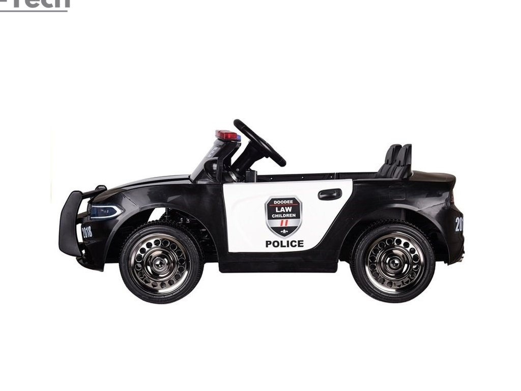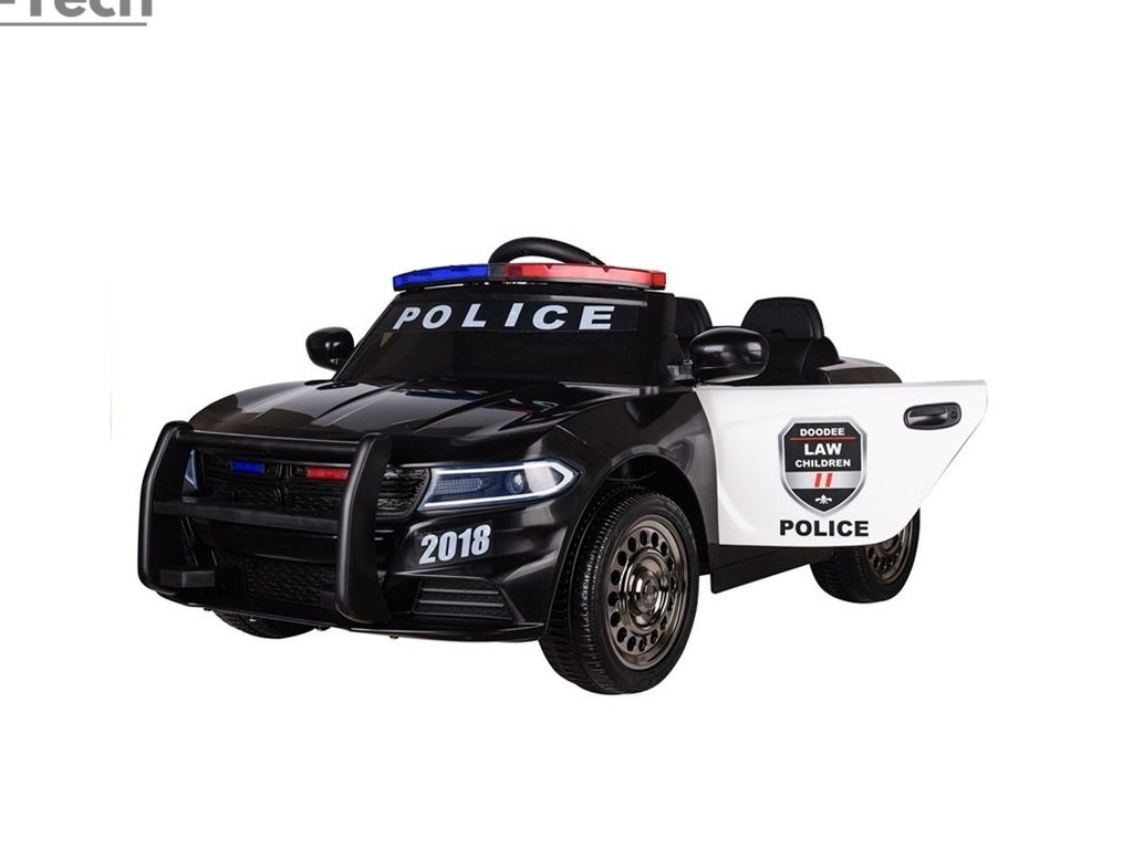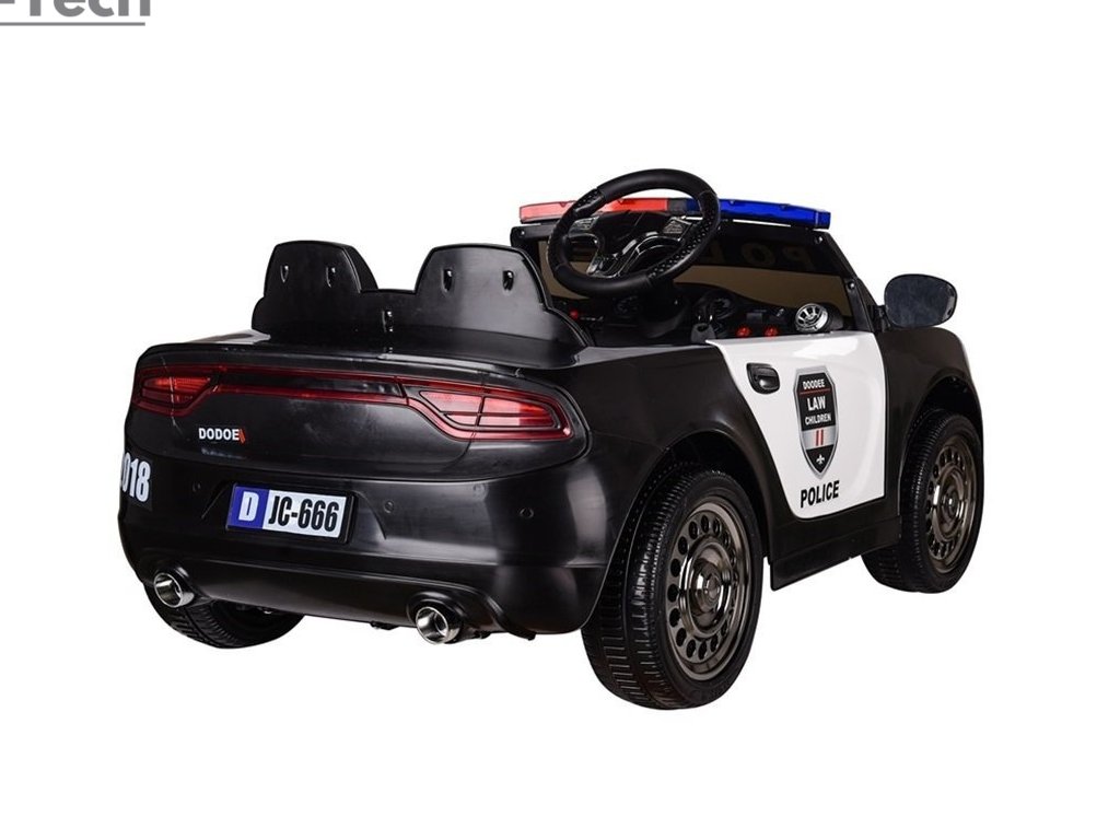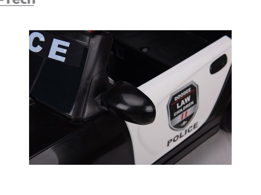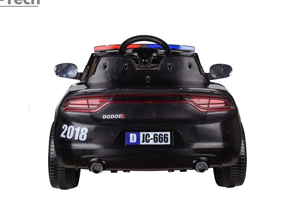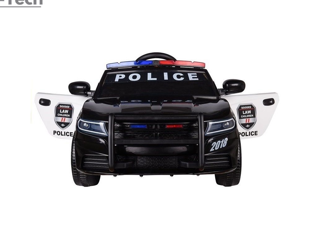 Predstavené čierne vozidlo na batérie púta pozornosť už z diaľky. Čierna karoséria je pokrytá množstvom nálepiek v kontrastných farbách, ktorých vzor je zachovaný v policajnej konvencii. Bude tam nápis POLÍCIA aj obrázky pripomínajúce skutočný policajný odznak. To nie je všetko? Nad tónovaným rámom čelného skla sú umiestnené modré a červené svetlá, ktoré určite vyčaria úsmev na tvári každého dieťaťa.