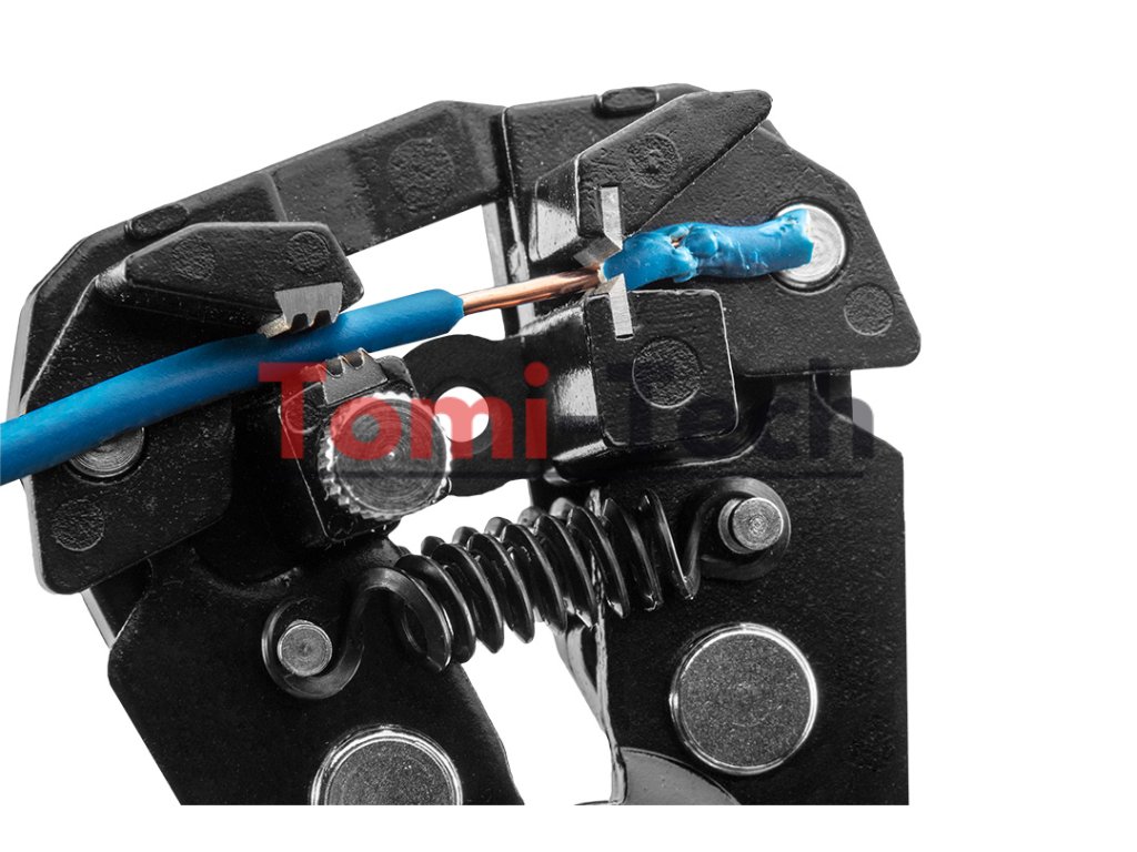 Automatické odizolovacie kliešte 160 mm, čelné, tvrdosť čeľustí 52-60 HRc, pracovný rozsah 0,5-6,0 mm2, rozsah krimpovania konektorových svoriek 1,5-6 mm2 (22-10AWG), kliešte na káble, dvojzložková rukoväťDodatočné parametre