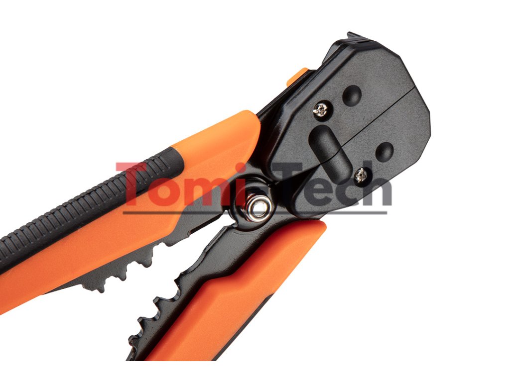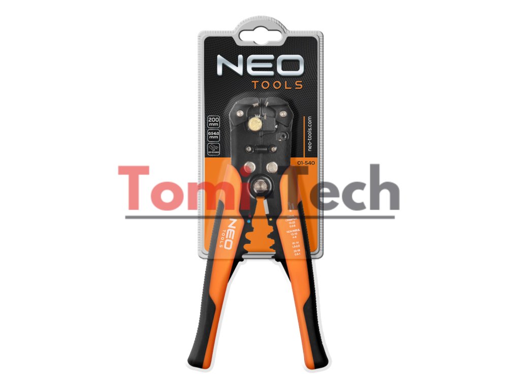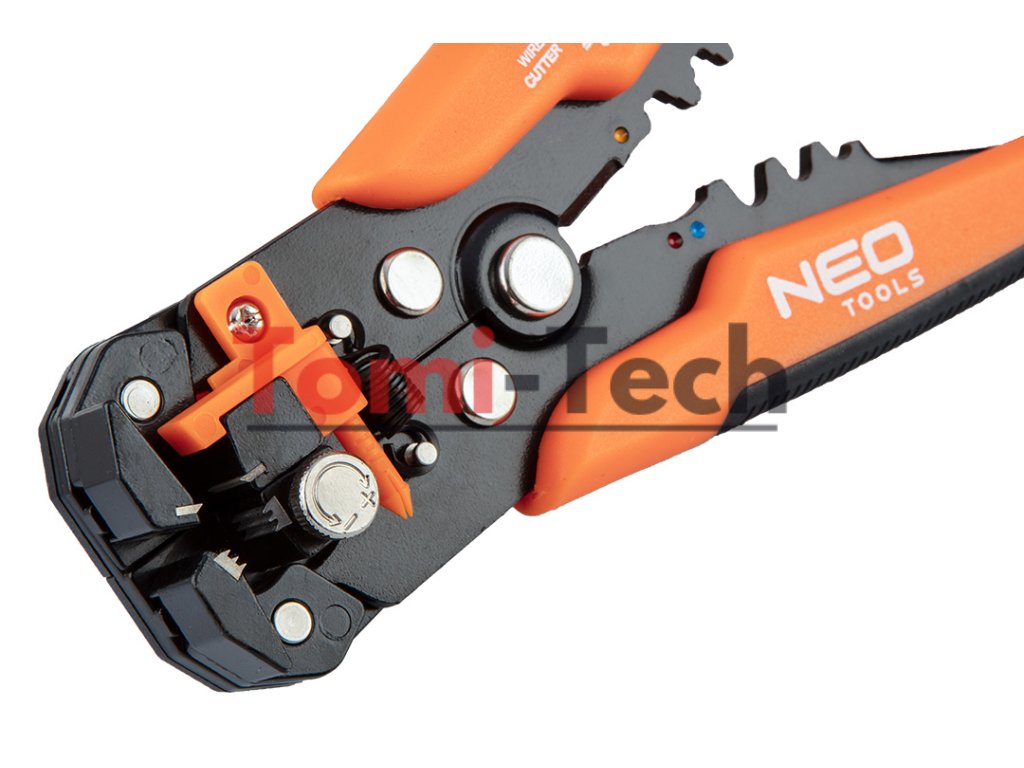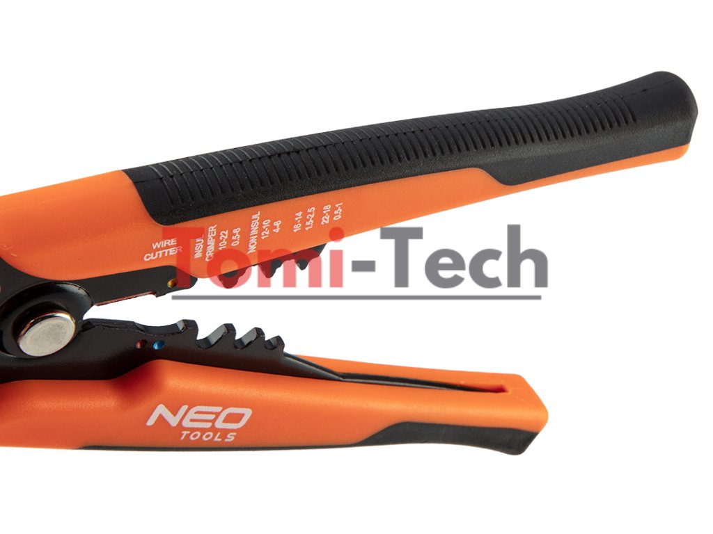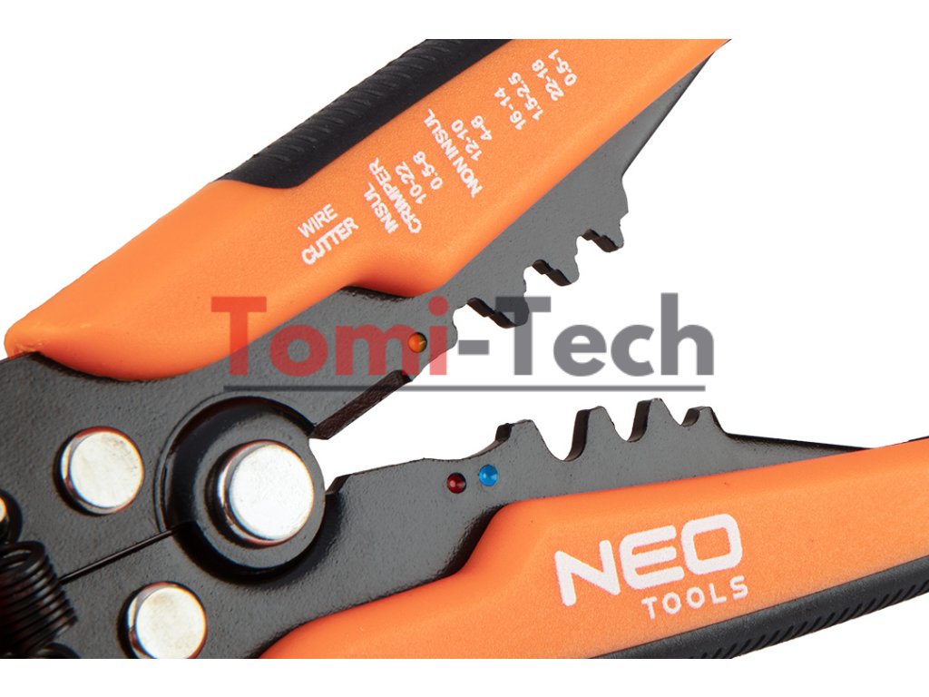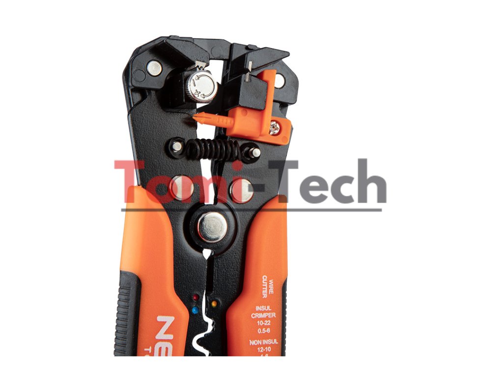 Automatické odizolovacie kliešte 200 mm, čelné, tvrdosť čeľustí 52-60 HRc, pracovný rozsah 0,5-6,0 mm2 (22-10 AWG), rozsah krimpovania pre neizolované konektorové svorky 0,5-6 mm2 a izolované 0,5-8 mm2, dvojzložková rukoväť TPR+ABS, oceľ čeľustí Cr12moVDodatočné parametre