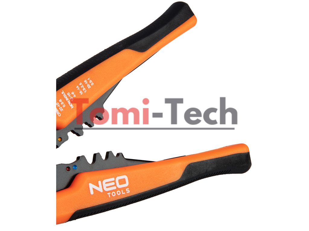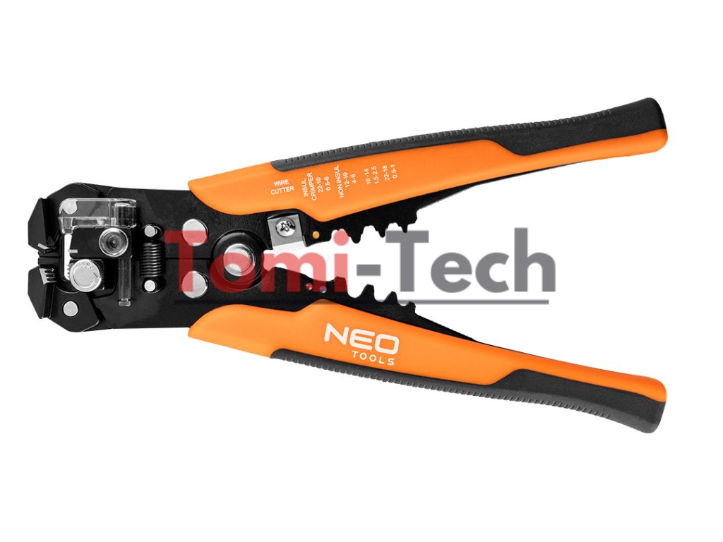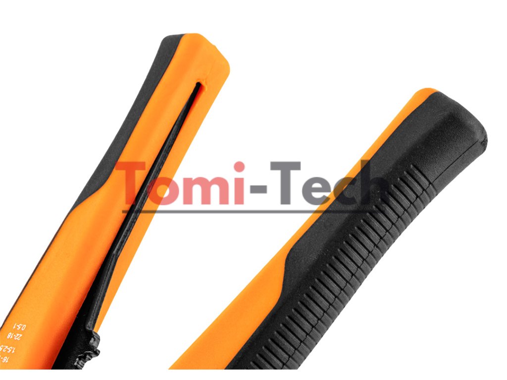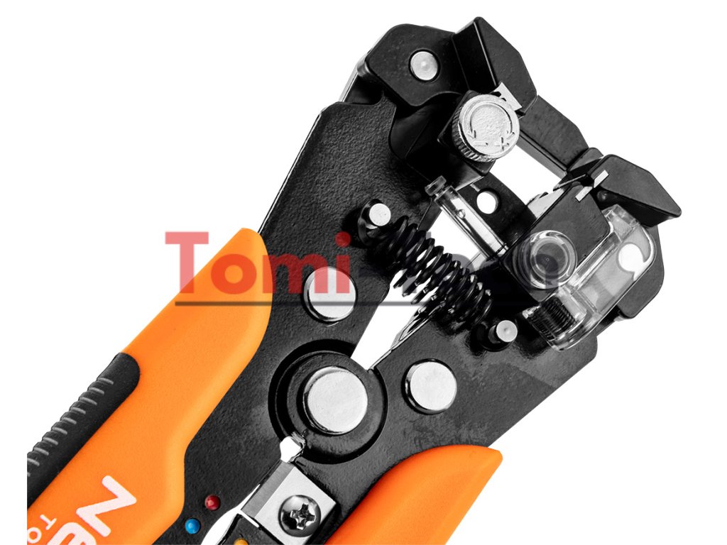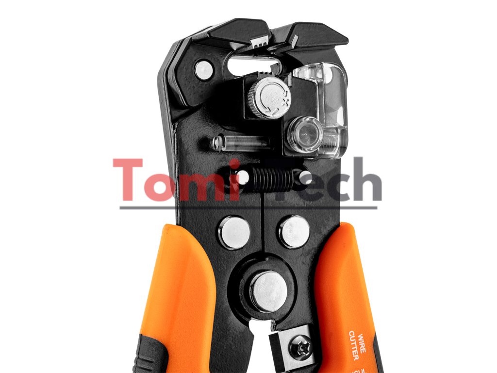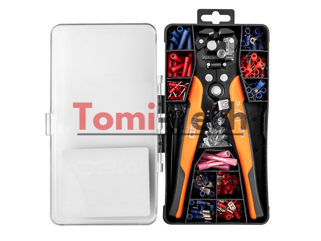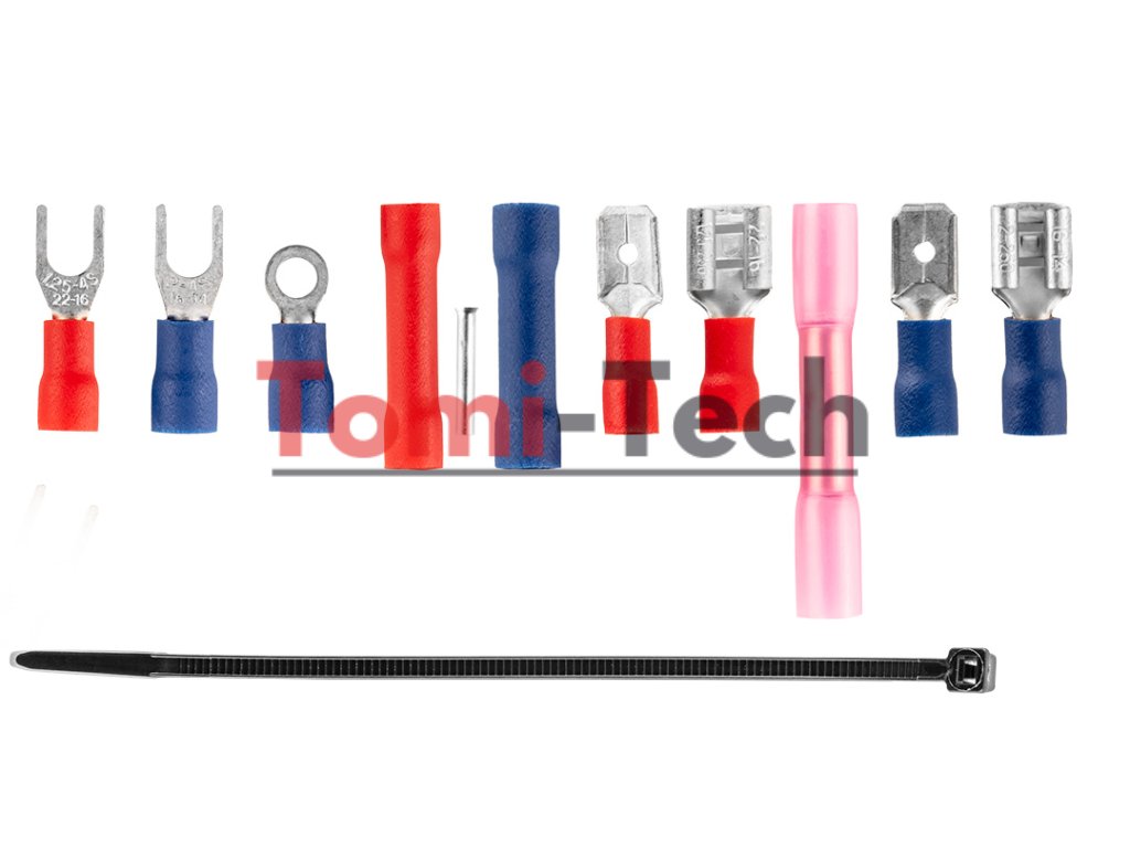 Automatické odizolovacie kliešte 205 mm, čelné, tvrdosť čeľustí 52-58 HRc, telo z ocele A3, pracovný rozsah 0,5-6,0 mm2 (22-10 AWG), rozsah krimpovania pre neizolované nástrčné konektory 0,5-6 mm2 a izolované 0,5-8 mm2, dvojzložková rukoväť TPR+PP, fréza v rukoväti, čeľusťová oceľ Cr12MoV, nastaviteľný obmedzovač izolácie, 230 izolovaných konektorov, červené konektory pre káble s priemerom 0,5-1,5 mm, modré konektory pre káble s priemerom 1,5-2,5 mm, typy: červené a modré izolované očkové konektory: po 15 kusov, červené a modré izolované vidlicové konektory: po 15 kusov, červené a modré izolované samičie objímkové konektory: po 15 kusov, červené a modré izolované samčie objímkové konektory: po 15 kusov, červené a modré izolované konektory: po 10 kusov, červené izolované konektory odolné voči striekajúcej vode: 10 kusov, červené izolované objímkové konektory 1,0 mm: 25 kusov, červené neizolované objímkové konektory 0,75 mm: 25 kusov, drôt 15 kusov, káblové zväzky 15 kusov 2,5x100 mm, čierneDodatočné parametre
