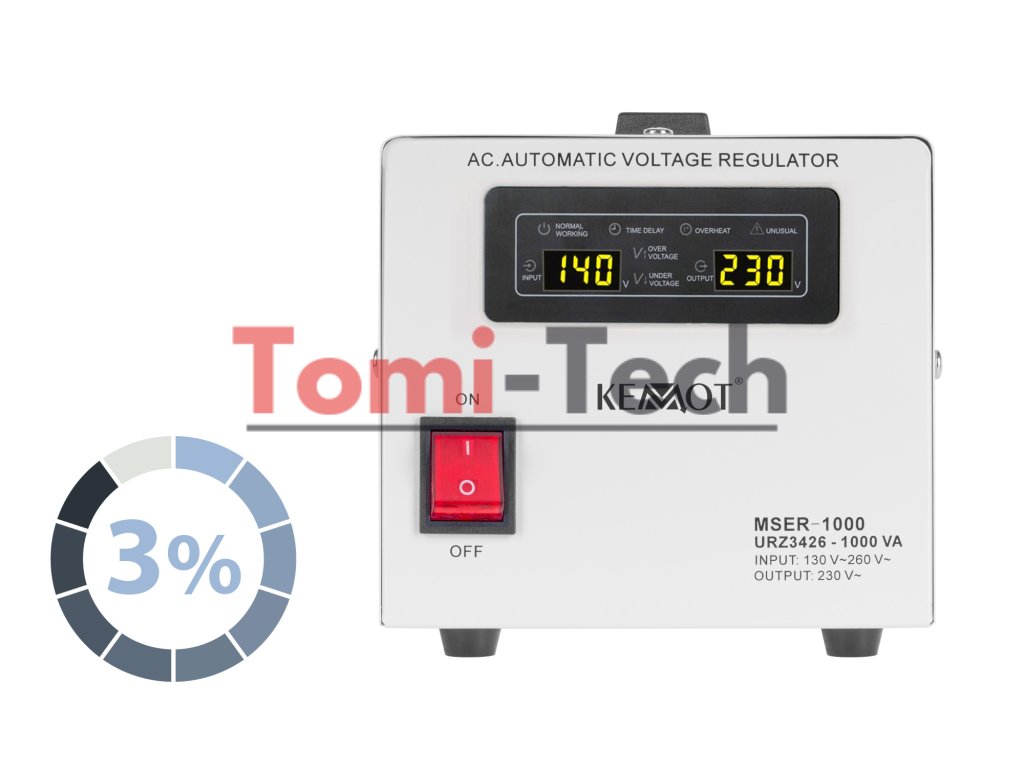 Stabilizátor napätia KEMOT MSER-1000 udržiava napätie s vysokou presnosťou až 3 %. Takáto vysoká presnosť prevádzky je výsledkom použitia servotechnológie.