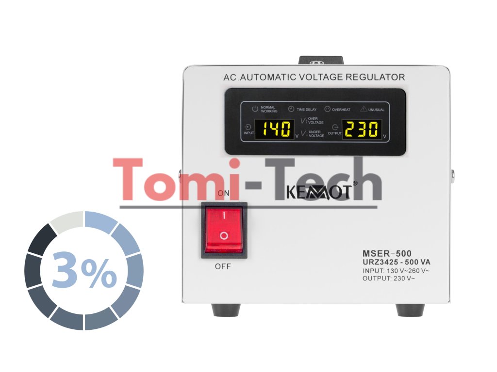 Stabilizátor napätia KEMOT MSER-500 udržiava napätie s vysokou presnosťou až 3 %. Takáto vysoká presnosť je výsledkom použitia technológie založenej na servomotoroch.