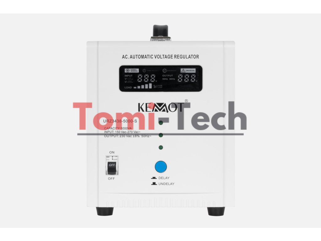 Ak potrebujete stabilizátor napätia pre zariadenia s vysokým okamžitým zapínacím prúdom, vyberte si model s funkciou oneskorenia zapnutia DELAY. KEMOT SER-5000-S je vybavený tlačidlom oneskorenia zapnutia DELAY s rozsahom 6 až 180 sekúnd, čo znižuje riziko poškodenia, keď majú pripojené zariadenia vysoký okamžitý zapínací prúd. Okrem toho má stabilizátor SER-5000-S ochranu pred príliš vysokým a nízkym napätím, preťažením, prehriatím a skratom.