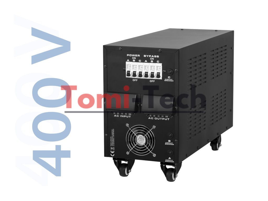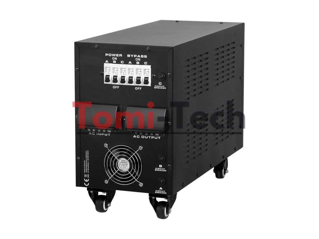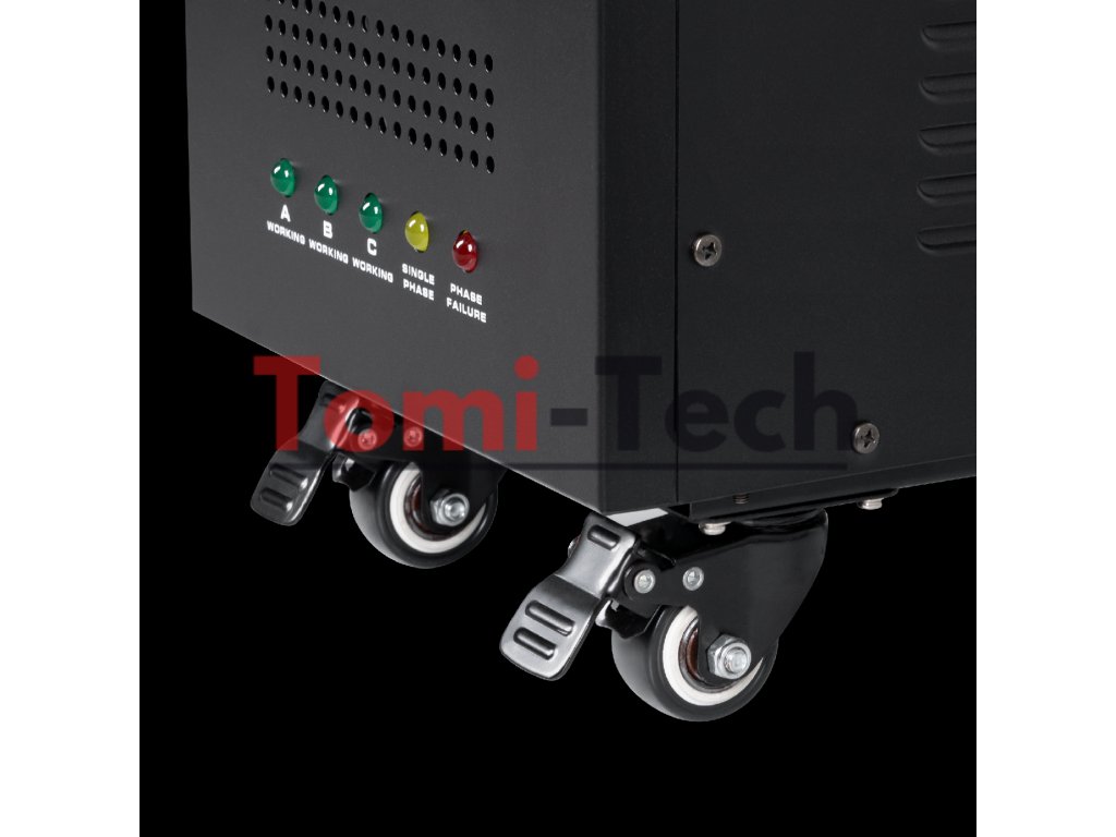 V trojfázovom režime je dôležité udržiavať rovnováhu medzi fázami. Stabilizátor monitoruje a reguluje napätie v každej fáze, aby sa zabezpečila súlad medzi nimi – kompenzuje príliš vysoké alebo príliš nízke vstupné napätie a po stabilizácii dodáva výstupné napätie. Ak v tomto režime niektorá z fáz nefunguje správne alebo nie je pripojená, zariadenie aktivuje ochranu a nedodá napätie na výstup, o čom informuje indikátorom „CHYBA FÁZY“.