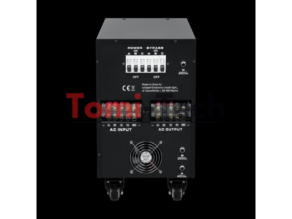 V trojfázovom režime je dôležité udržiavať rovnováhu medzi fázami. Stabilizátor monitoruje a reguluje napätie v každej fáze, aby zabezpečil konzistenciu medzi nimi – kompenzuje príliš vysoké alebo príliš nízke vstupné napätie a po stabilizácii dodáva výstupné napätie. Ak v tomto režime niektorá z fáz nefunguje správne alebo nie je pripojená, zariadenie aktivuje ochranu a nedodá napätie na výstup, o čom informuje indikátorom „CHYBA FÁZY“.