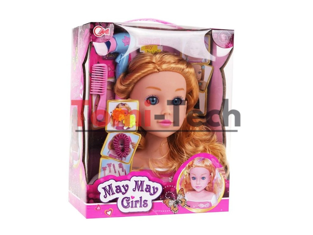 Rozmery :stylingová hlava bábiky cca 20 cm x 17 cm x 11,5 cm,fén cca 7,5 cm x 3 cm x 8 cm,hrebeň cca 8,5 cm x 4 cm,sponky do vlasov cca 2,5 cm,gumička do vlasov cca 3 cm x 2,5 cm,balenie cca 28 cm x 22,5 cm x 12 cm.
