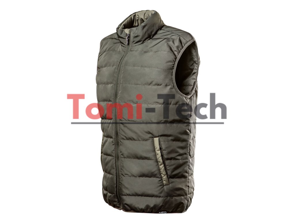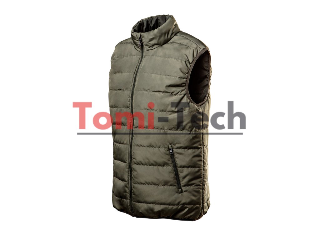 Obojstranná pracovná vesta CAMO, veľkosť M, prešívaná, vrchná látka 100 % polyester 80 g/m2, syntetická výplň 160 g/m2 (100 % polyester), vrecká so zipsami na svetlejšej strane, otvorené na tmavšej strane, vodeodolný záter, elastický lem, certifikácia CEDodatočné parametre