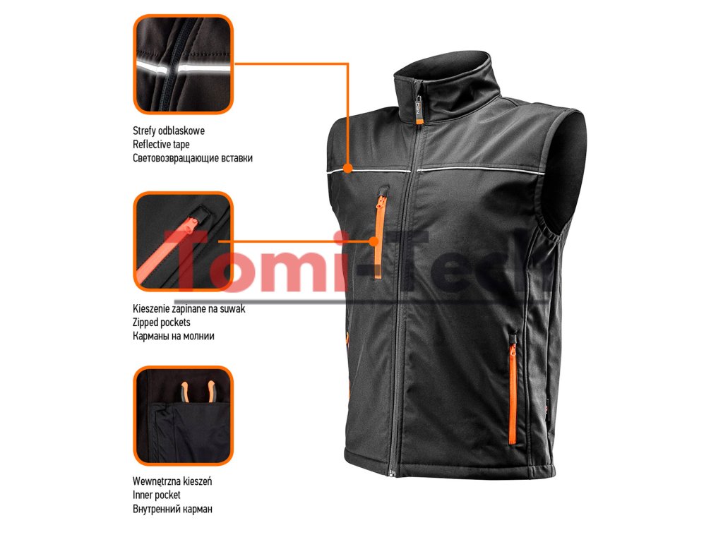 Softshellová pracovná vesta, veľkosť M, nepremokavý a priedušný materiál, nastaviteľný pás, reflexné prvky, certifikácia CEDodatočné parametre
