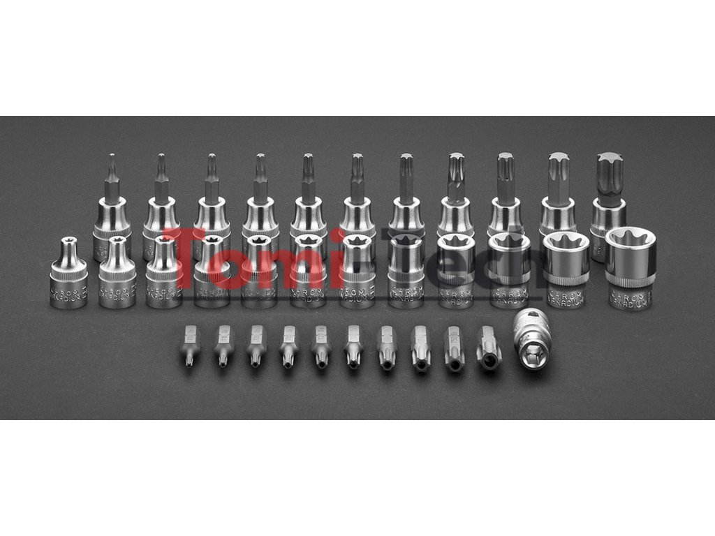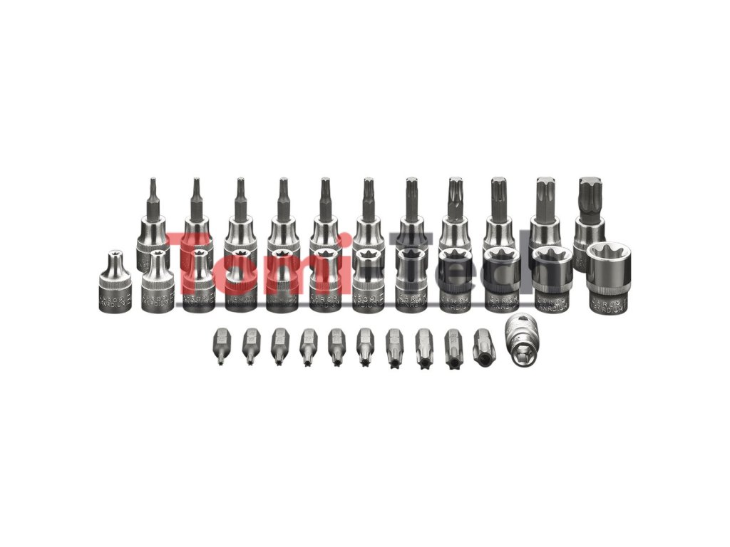 Sada bitov Torx 3/8" 34 ks, objímky E-Torx: E4-5-6-7-8-10-11-12-14-16-18-20, bity Torx na objímke: T10-15-20-25-27-30-40-45-50-55-60, bity Torx s otvorom (zabezpečené proti neoprávnenej manipulácii): T10-15-20-25-27-30-40-45-50-55, adaptér na bit 8 mm, objímky z ocele CrV, oceľové bity S2, certifikát TÜV M+T, 25-ročná záruka.Dodatočné parametre