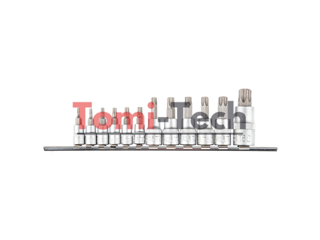Bity Torx s objímkou 1/4", 3/8", 1/2"; sada 12 kusov; veľkosti: 1/4": T10, T15, T20, T25, T27, T30; 3/8": T40, T45, T47, T50, T55; 1/2": T60.Dodatočné parametre