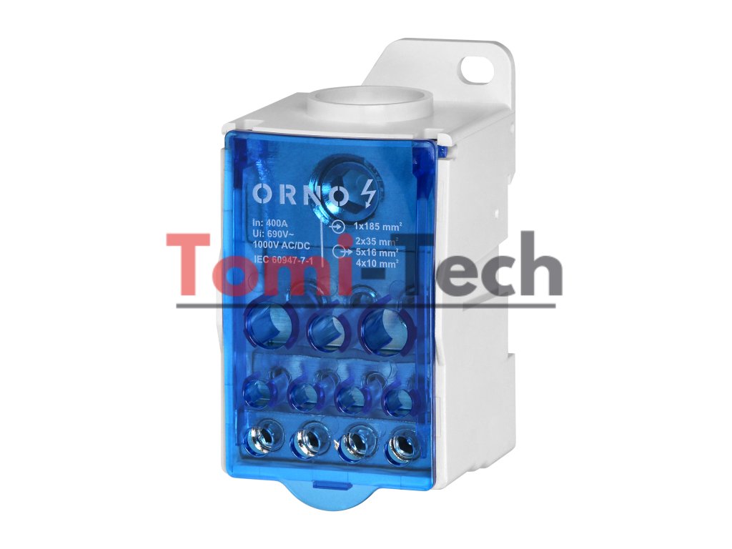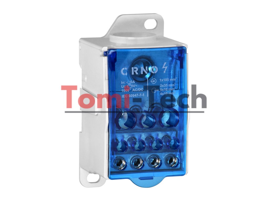 Rozvodný blok 400A, vstupná svorkovnica 1x185mm², výstupné svorkovnice 4x10 a 5x16 a 2x35mm², pohodlná montáž na DIN lištu