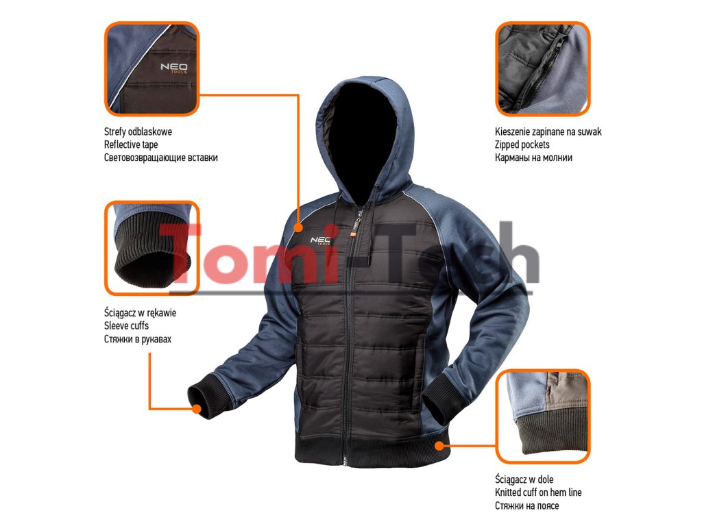 Pletená, zateplená mikina s kapucňou, veľkosť M, polyesterová podšívka, vrecká na zips, elastické manžety a pás, reflexné prvky, kapucňa so sťahovacou šnúrkou, certifikát CEDodatočné parametre