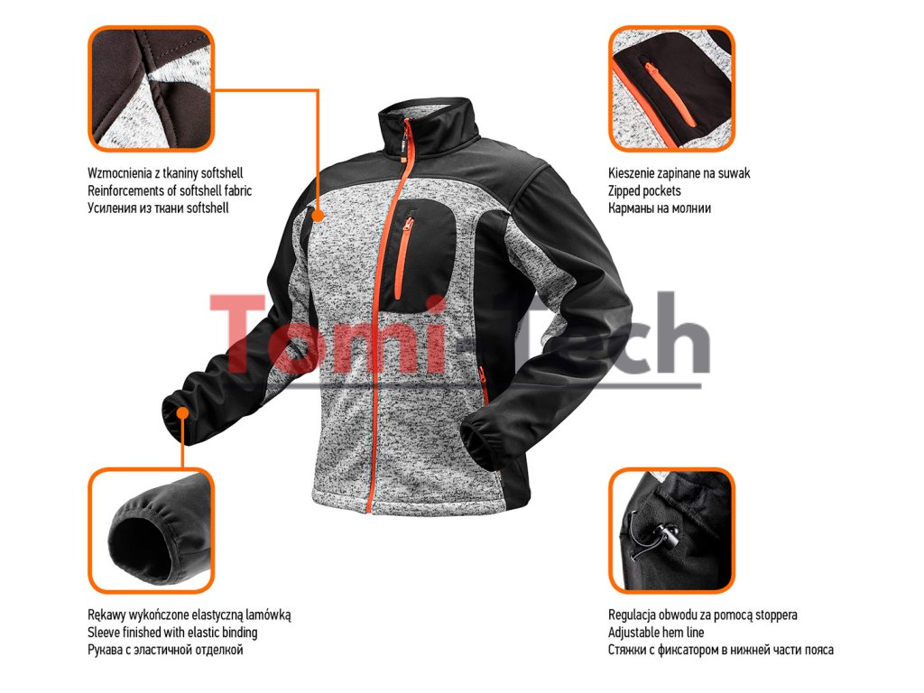 Pletená mikina vystužená softshellovou tkaninou, veľkosť XXL, vrecká na zips, elastické manžety a nastaviteľný pás, mäkká vnútorná úprava, certifikácia CEDodatočné parametre