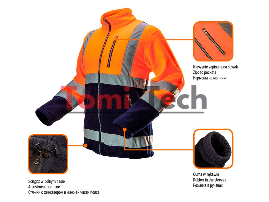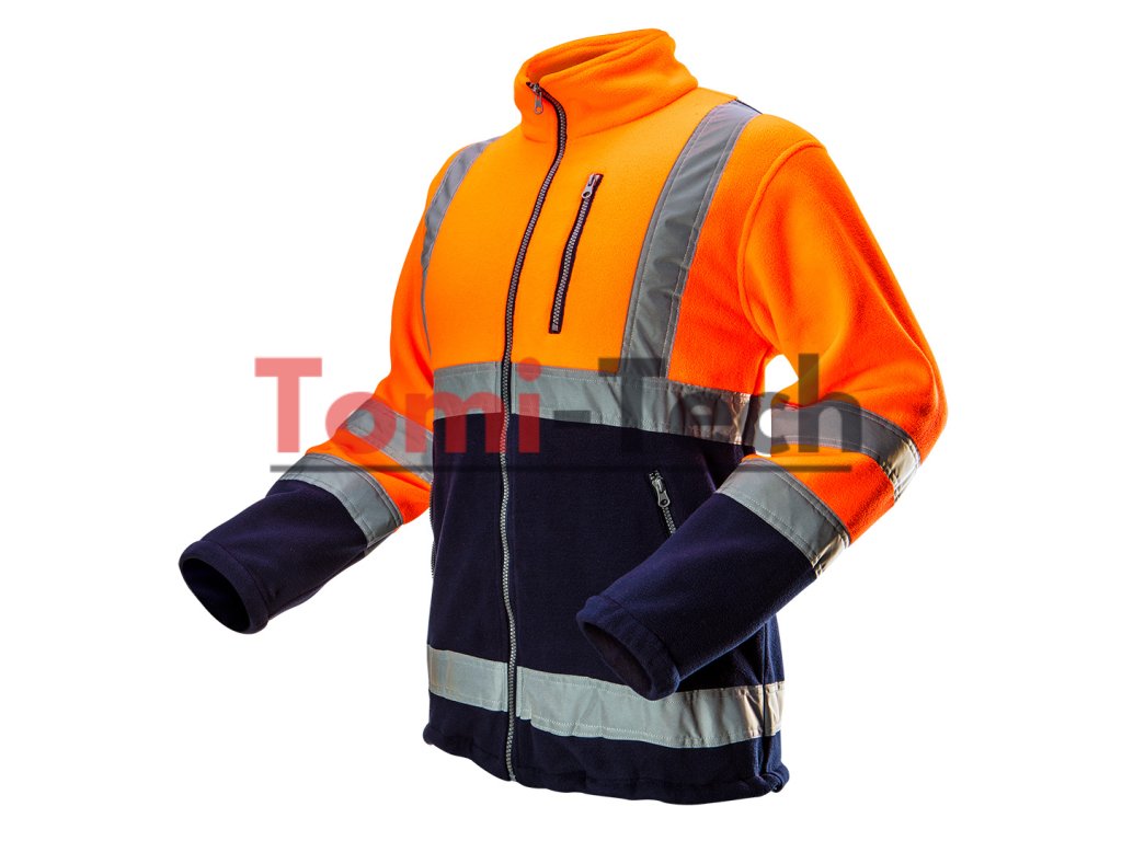 Výstražná oranžová flísová bunda, veľkosť L, trieda 2 podľa normy EN ISO 20471, vyrobená z vysoko kvalitného flísu s gramážou 280 g/m², 3 vrecká na zips, tmavé vložky v miestach vystavených znečisteniu, certifikát CE, EN ISO 13688:2013Dodatočné parametre