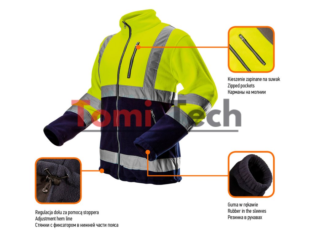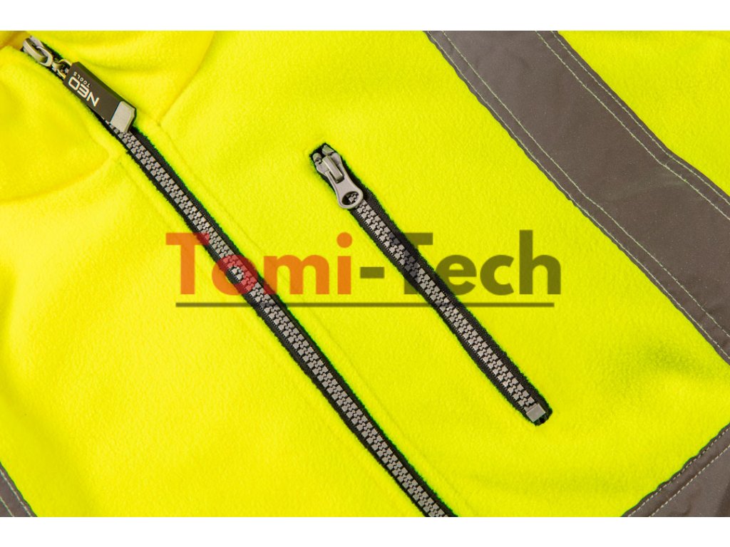 Žltá flísová bunda s vysokou viditeľnosťou, veľkosť M, trieda 2 podľa normy EN ISO 20471, vyrobená z vysoko kvalitného flísu s gramážou 280 g/m², 3 vrecká na zips, tmavé vložky na miestach vystavených znečisteniu, certifikát CE, EN ISO 13688:2013Dodatočné parametre