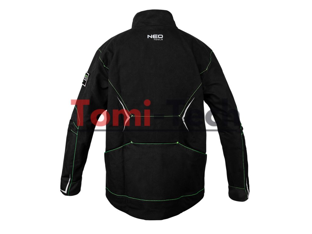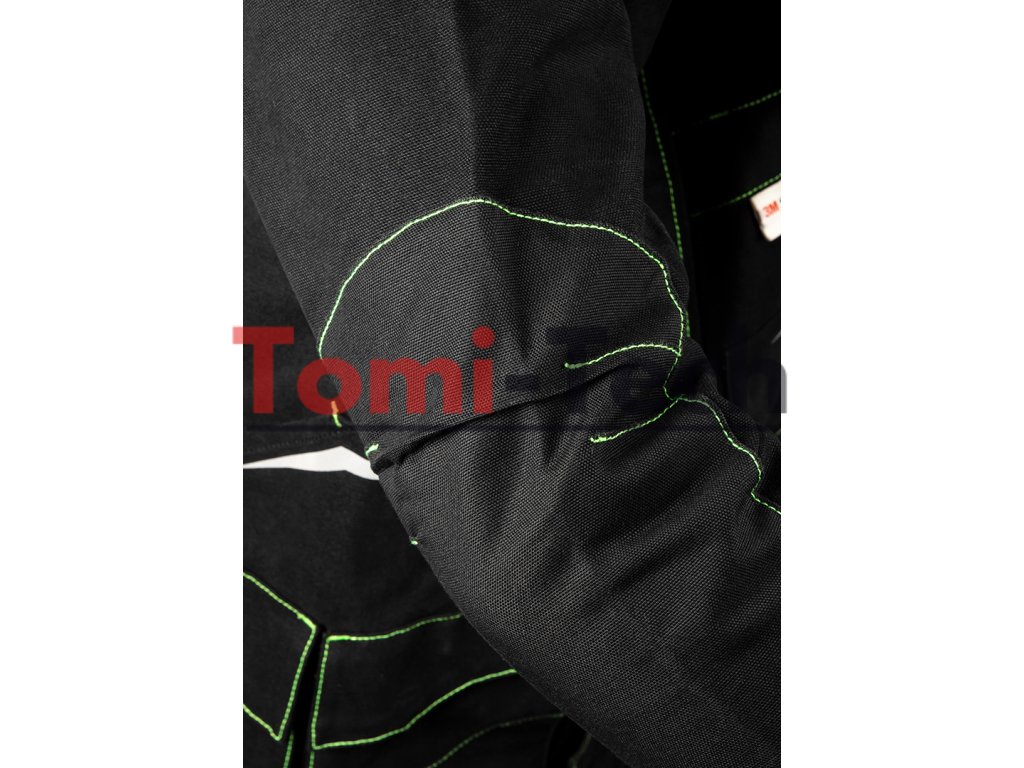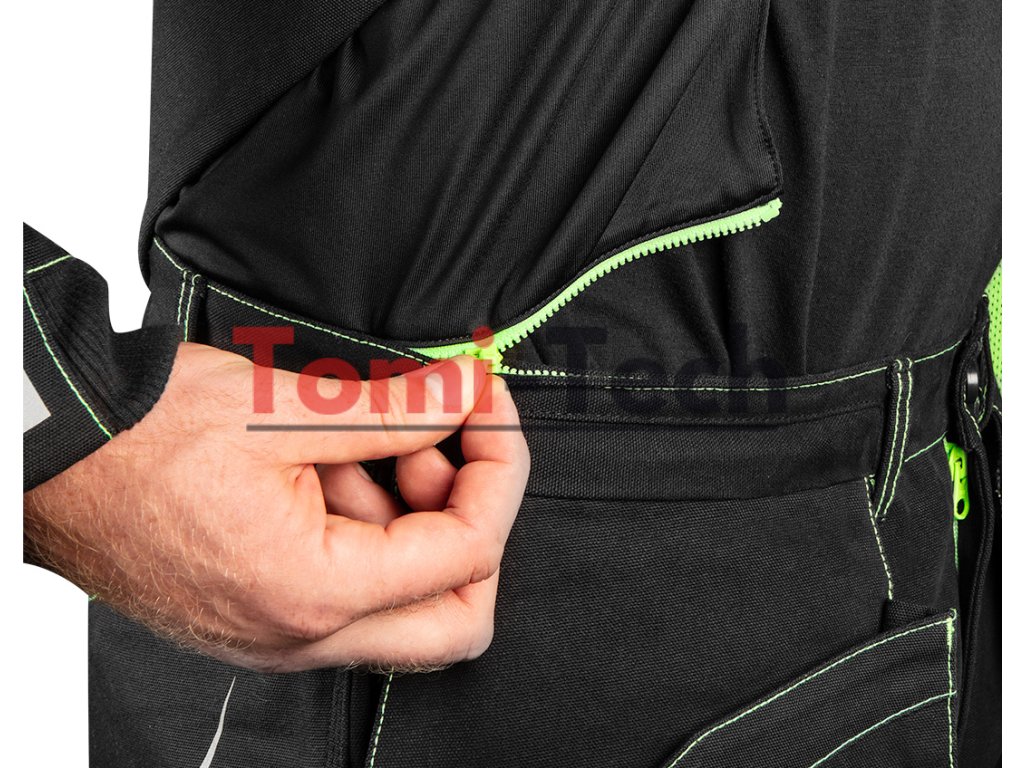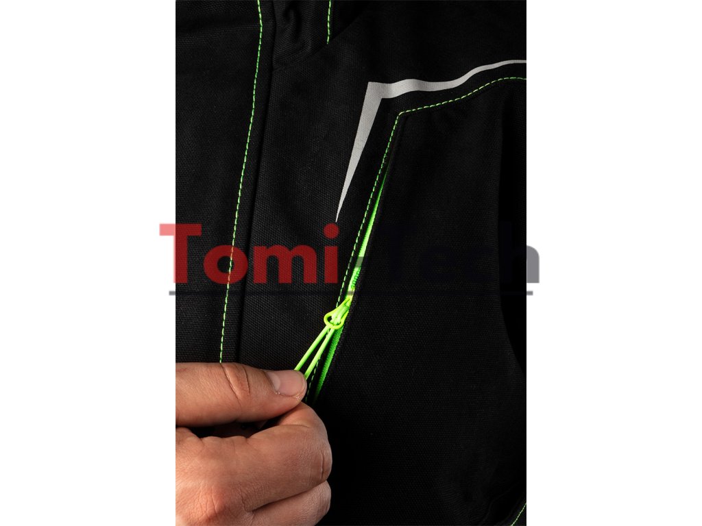 Pracovná mikina PREMIUM PRO, čierna s neónovo zeleným prešívaním, zloženie hlavného materiálu: 100% bavlnené plátno s gramážou 425 g/m2, zloženie materiálu výstuh: 75% bavlna, 25% nylon, Cordura NYCO s gramážou 272 g/m2, možno kombinovať s nohavicami 81-234 a vytvoriť tak overal, 12 multifunkčných vreciek na zips alebo magnetické patentky, tvarované rukávy s gumou v spodnej časti, predĺžený chrbát s ďalšími vreckami, výstuhy Cordura NYCO na vreckách, rukávoch, ramenách a chrbte, zipsy YKK, reflexné prvky 3M, vonkajšia nášivka na ramene so suchým zipsom s možnosťou umiestnenia vlastného loga, vnútorná menovka, jedinečný vlastný dizajn, certifikát CE, veľkosť LDodatočné parametre