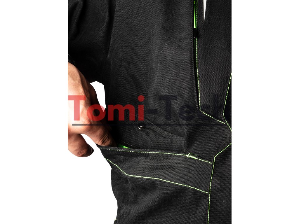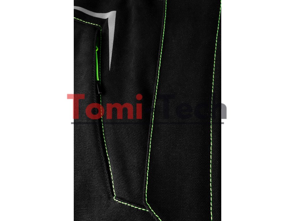 Pracovná mikina PREMIUM PRO, čierna s neónovo zeleným prešívaním, zloženie hlavného materiálu: 100% bavlnené plátno s gramážou 425 g/m2, zloženie materiálu výstuh: 75% bavlna, 25% nylon, Cordura NYCO s gramážou 272 g/m2, možno kombinovať s nohavicami 81-234 a vytvoriť tak overal, 12 multifunkčných vreciek so zipsom alebo magnetickými patentkami, tvarované rukávy s gumou v spodnej časti, predĺžený chrbát s ďalšími vreckami, výstuhy Cordura NYCO na vreckách, rukávoch, ramenách a chrbte, zipsy YKK, reflexné prvky 3M, vonkajšia nášivka na ramene so suchým zipsom s možnosťou umiestnenia vlastného loga, vnútorná menovka, jedinečný vlastný dizajn, certifikát CE, veľkosť XXXLDodatočné parametre