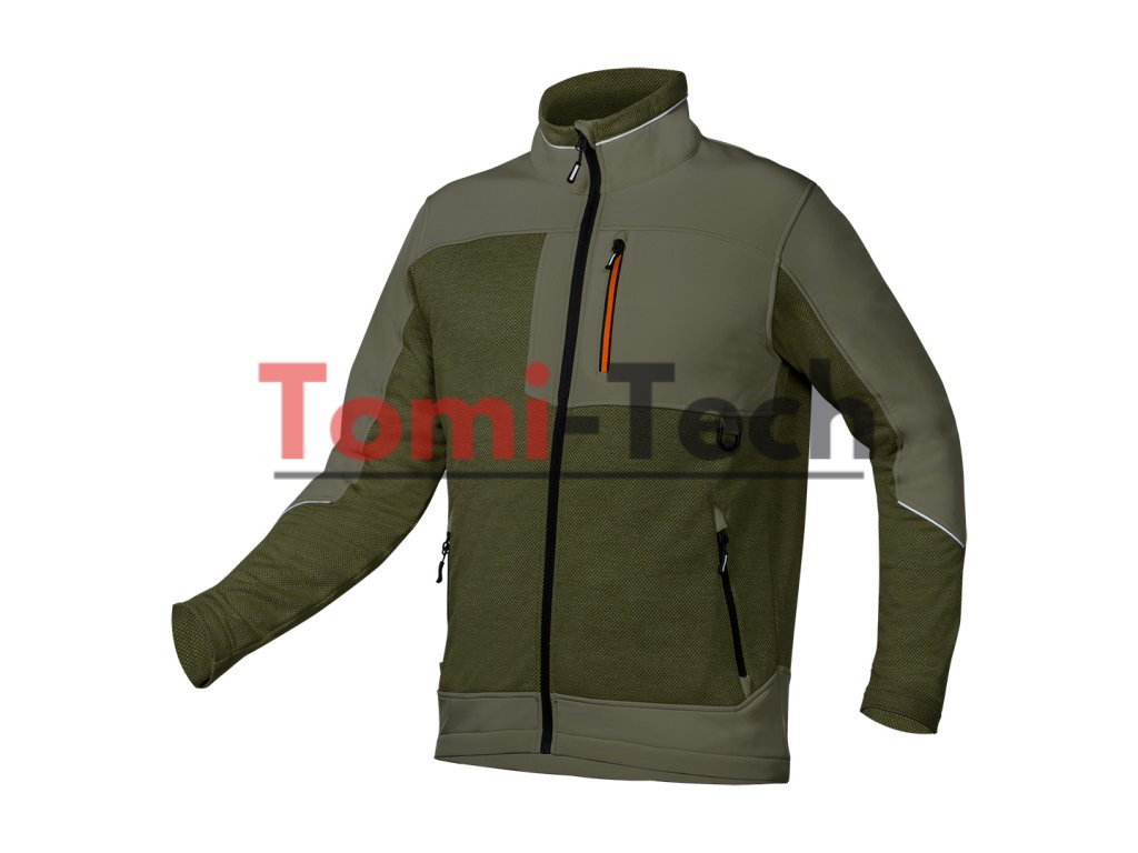 Pracovná mikina OUTDOOR, pletená s väzbou "rybia šupina" a softshellovými výložkami, zapínanie na zips, olivovozelená farba, zloženie materiálu: 100% polyester, gramáž: 265g/m2, softshellové výstelky na leme, stojačik, rukávy, vrecko a spodná časť mikiny, náprsné vrecko na zips, bočné vrecká na zips, pútko na náradie, potlačené logo na krku, menovka, balenie: recyklovaný plastový obal, certifikát CE, veľkosť XLDodatočné parametre