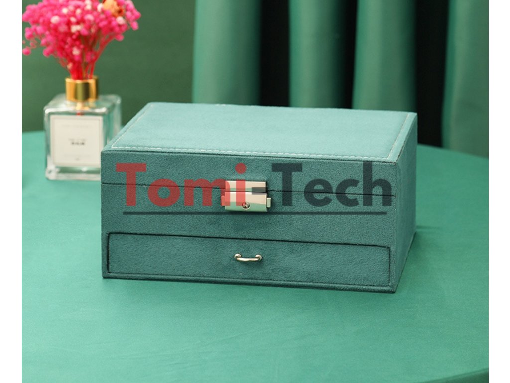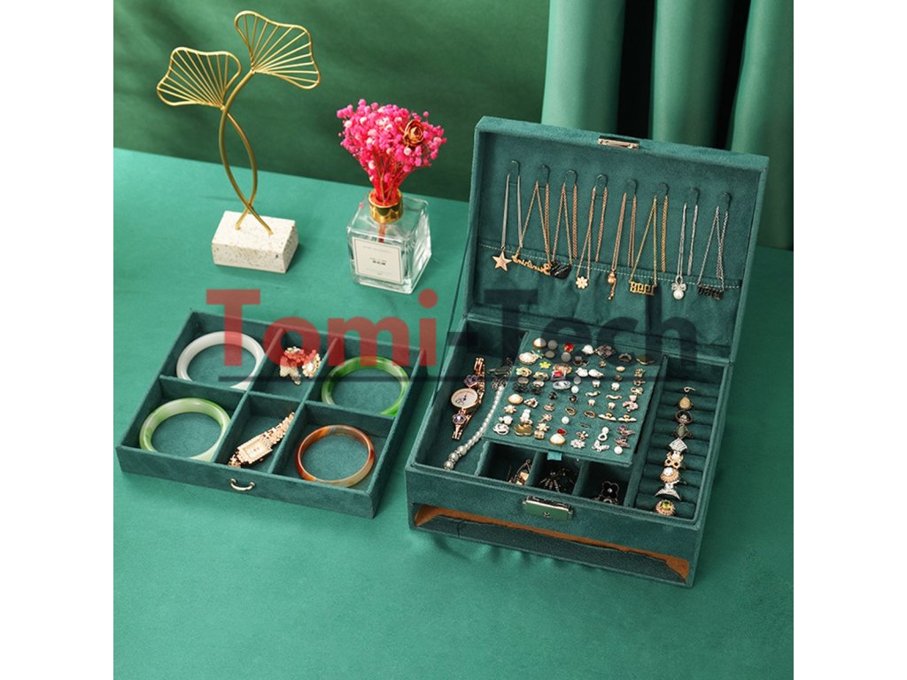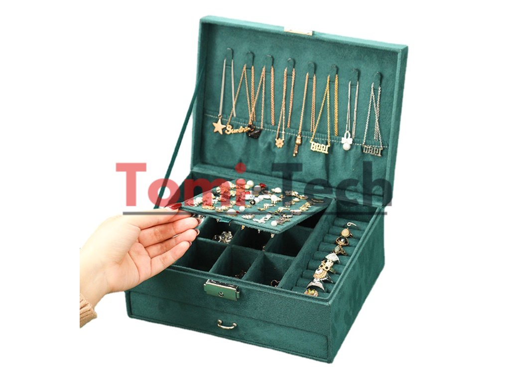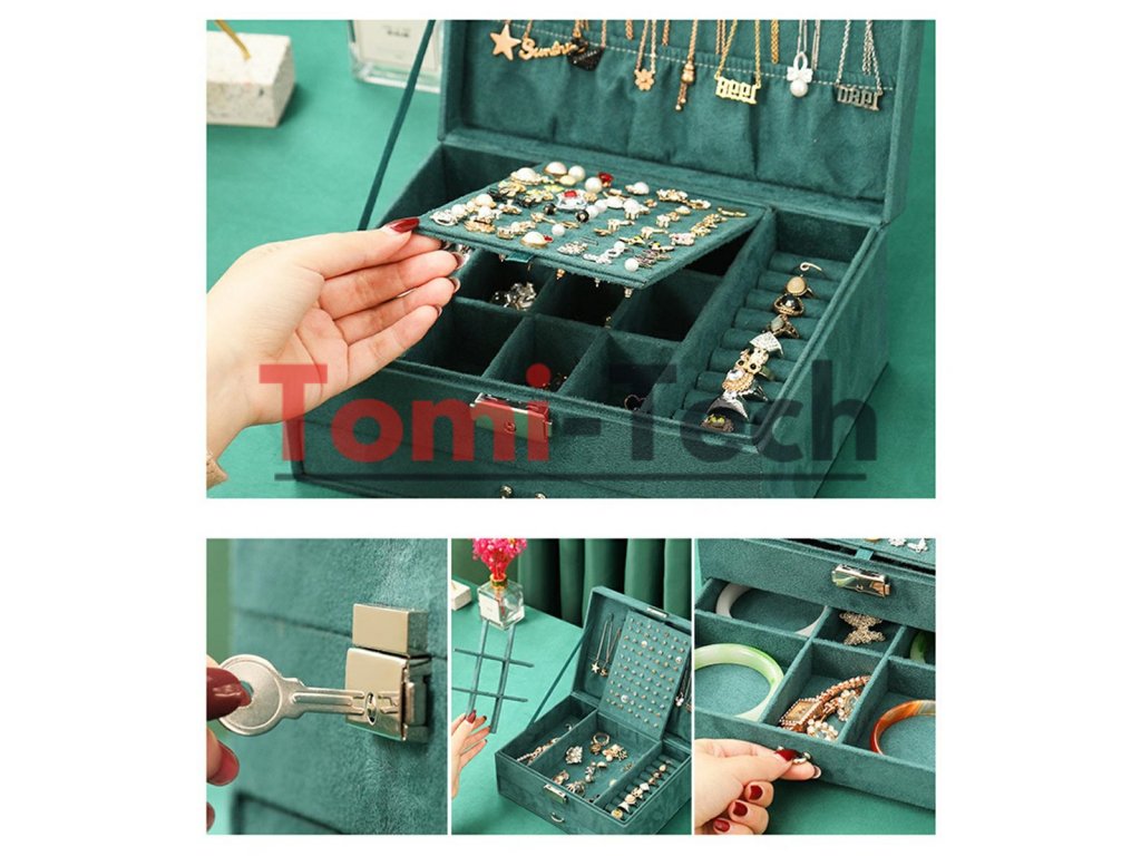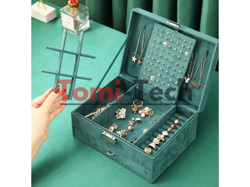 Mimoriadne funkčný a kompaktný organizér na šperky. Veľmi praktický nástroj, ktorý dokonale chráni vaše šperky pred prachom a škrabancami. Zatvára sa pevnou kovovou západkou. Potiahnutý mäkkým zamatovým materiálom (zvnútra aj zvonka). Množstvo príveskov, priestranné priehradky a výsuvná zásuvka v spodnej časti škatule poskytujú dostatok priestoru pre vaše drobnosti.