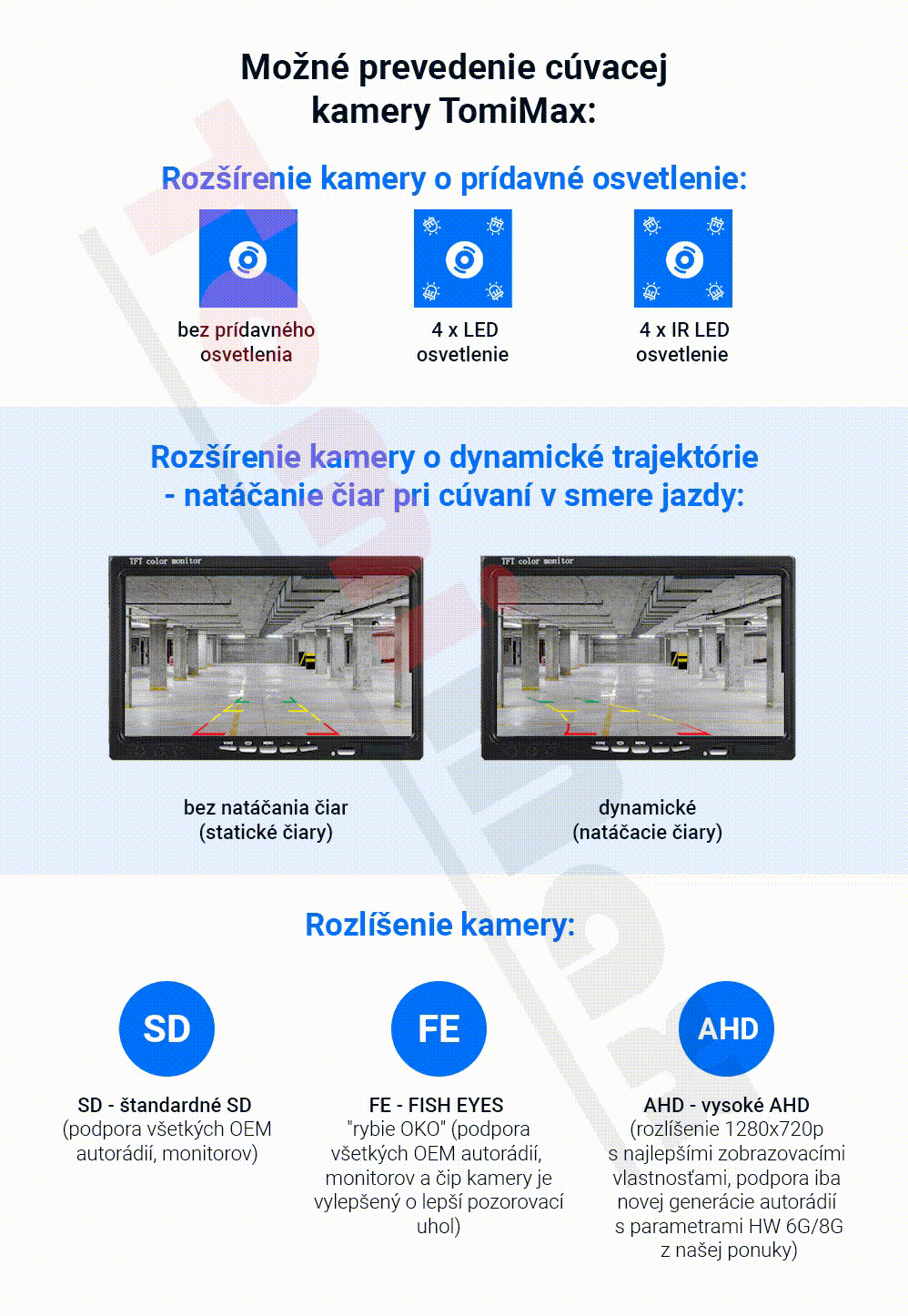 Farebná kamera s LED osvetlením pre ŠPZ. Je určená pre zabudovanie do osvetlenia nad zadnú registračnú značku. Kamera zároveň zobrazuje pomocné trajektórie pre parkovanie. Pre originálny design západné priamo na určený model automobilu. Disponuje veľkým 170° uhlom. Video signál z kamery je vyvedený na 6m kábli s RCA koncovkami.