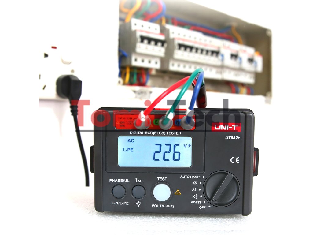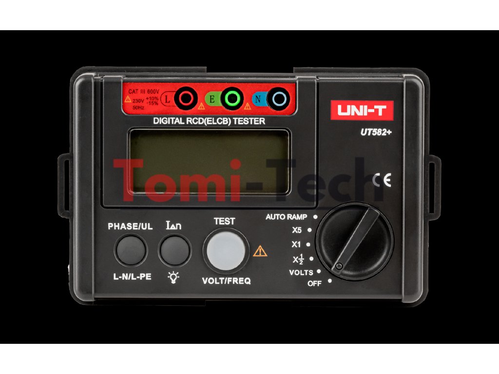 Uni-T UT582+ umožňuje testovanie prúdových chráničov s menovitými prúdmi 10/20/30/100/300/500 mA. Tester presne meria čas vypnutia ističa v troch režimoch (x1, x5), ktoré zodpovedajú 2000 ms, 1000 ms a 300 ms. Okrem toho sa prúd vypnutia prúdového chrániča meria v rozsahu od 20 % do 110 % menovitej hodnoty s maximálnym časom merania 300 ms.