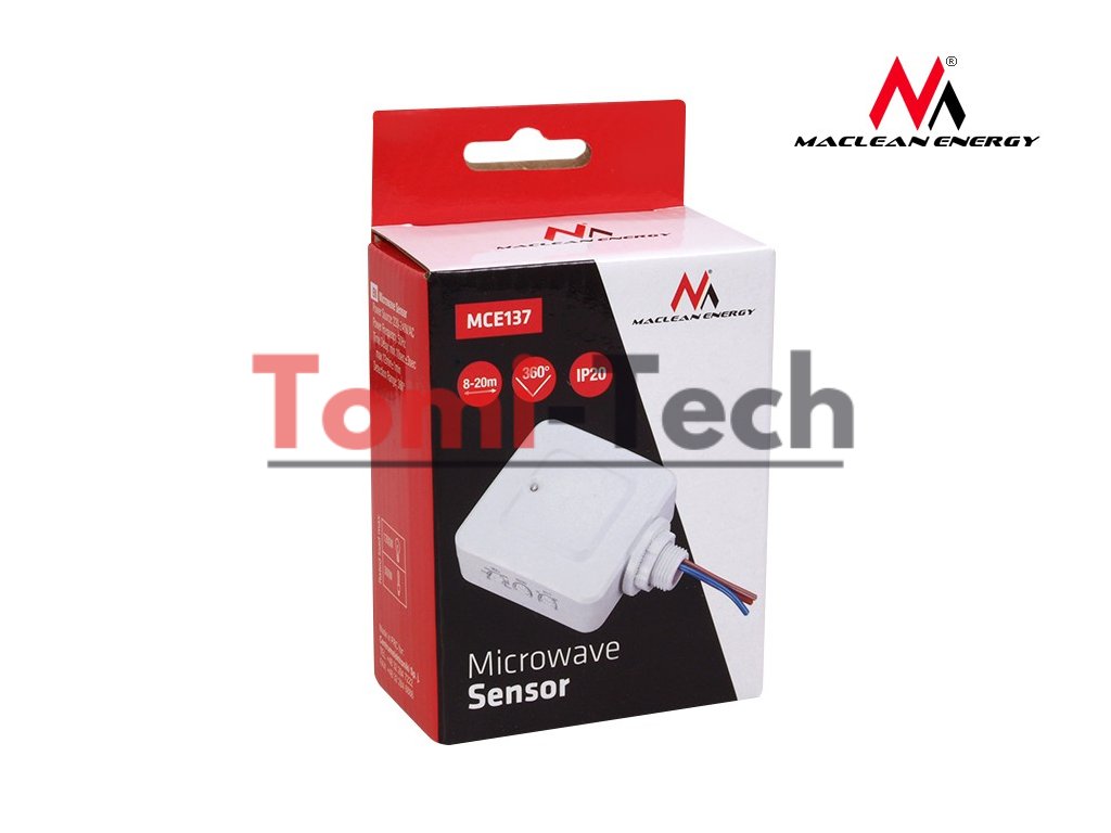 Vďaka použitiu mikrovlnného senzora je možné detekovať pohyb cez sklenené, plastové a drevené prekážky, ako sú dvere alebo okná. Mikrovlnný senzor pohybu MCE137 je určený na automatické ovládanie osvetlenia vnútorných a vonkajších častí miestností, ako sú schodiská, chodby, pivnice, garáže, šatne, toalety atď.