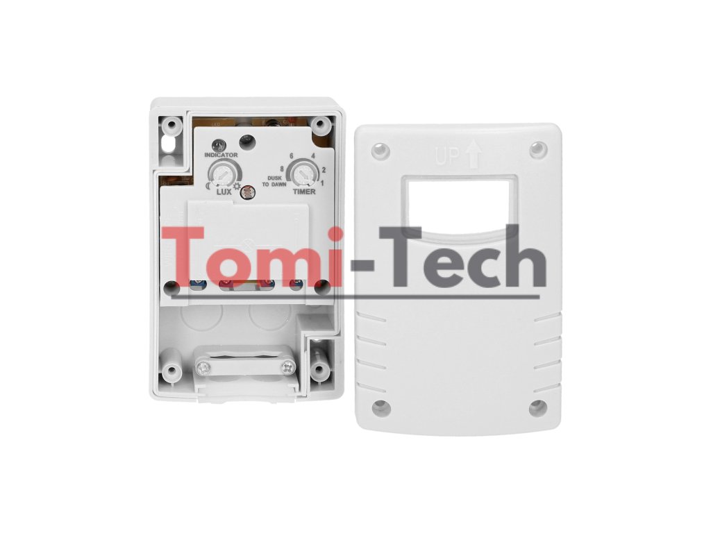 Toto zariadenie slúži na automatické ovládanie osvetlenia alebo iných elektrických zariadení a zároveň šetrí energiu. Jeho funkciou je zapojiť a odpojiť elektrický obvod, ak intenzita svetla klesne pod stanovenú úroveň alebo prednastavený čas. Potenciometre nastavujú čas svietenia a intenzitu svetla. Oneskorenie zapnutia: 60 sekúnd pre zapnutie/vypnutie.Dodatočné parametre