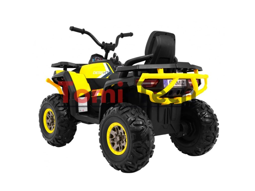 Detská elektrická štvorkolka je vybavená štyrmi elektrickými motormi a širokými kolesami z Eva materiálu. Štvorkolka hravo zvládne rôzne typy terénu, nespevnený povrch aj kopce.Medzi vybavenie patrí hudobný panel so vstupmi MP3, SD, AUX, USB a vopred nahranými melódiami. Štvorkolka Desert má predné aj zadné LED svetlá , umožňuje jazdu vo všetkých smeroch a jej nosnosť je do 50 kg .Vozidlo smie vodič ovládať úplne samostatne, avšak do jazdy môžu zasahovať rodičia pomocou diaľkového ovládača. Ovládač je vybavený tlačidlami s 3 rýchlosťami a bezpečnostným tlačidlom Stop, ktoré ihneď zastaví vozidlo a vypne všetky jeho funkcie.