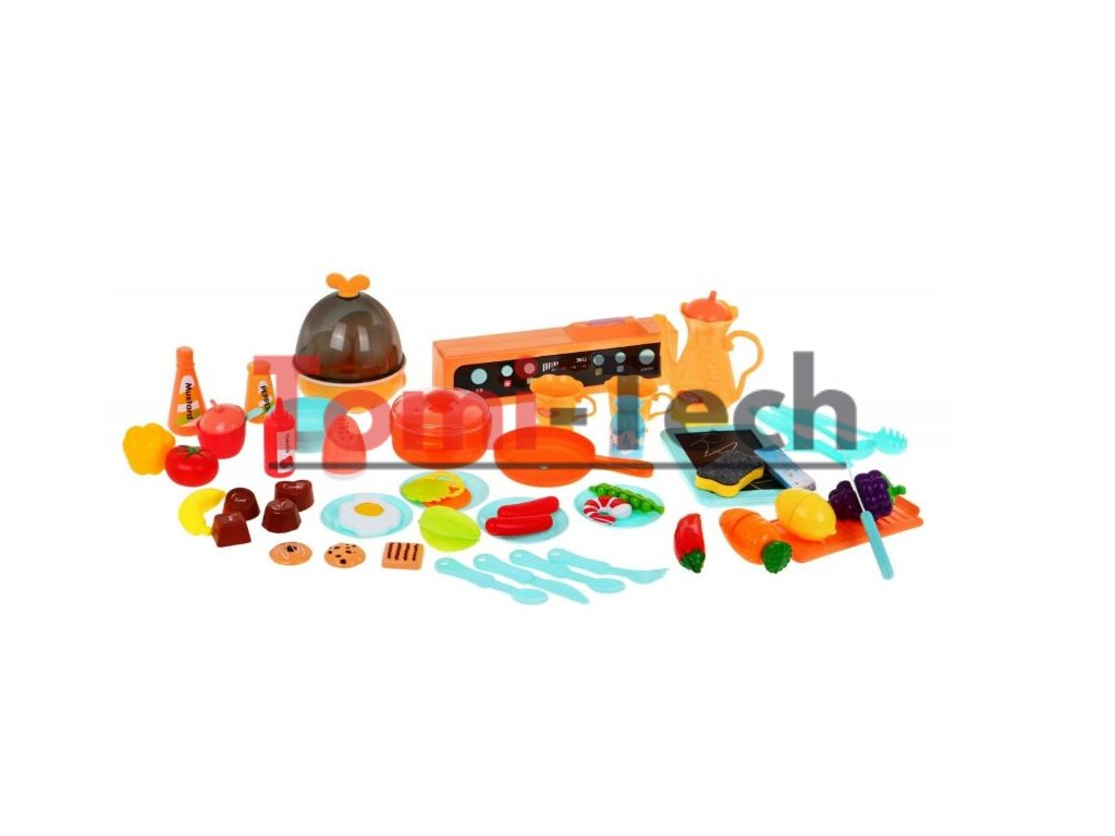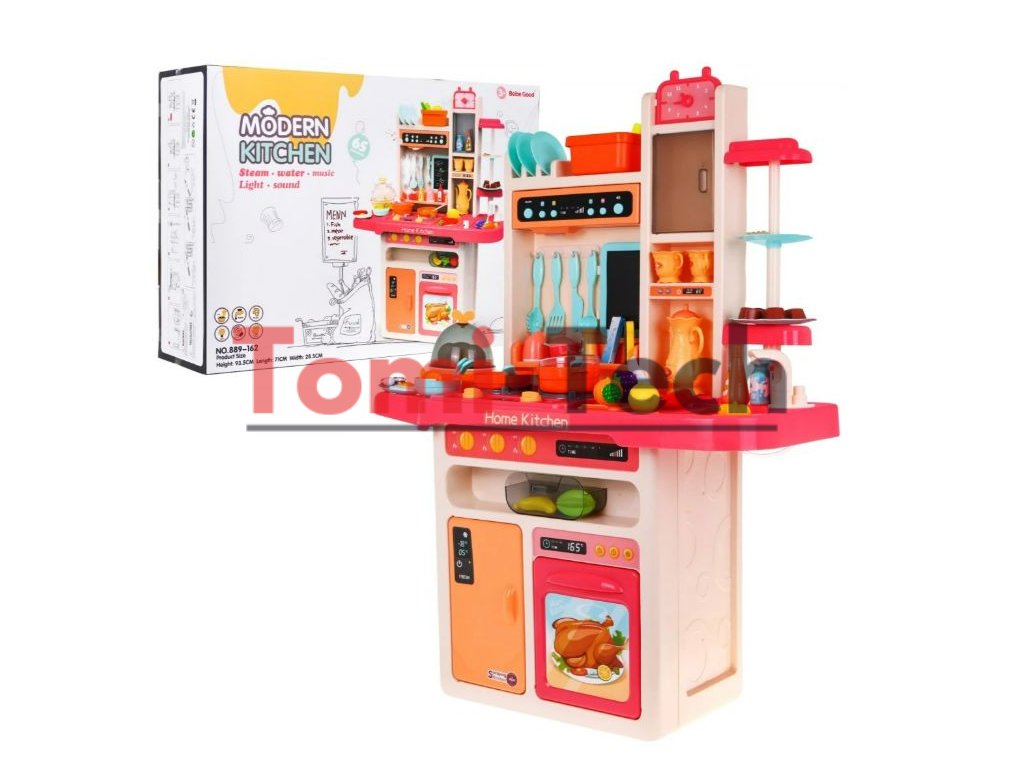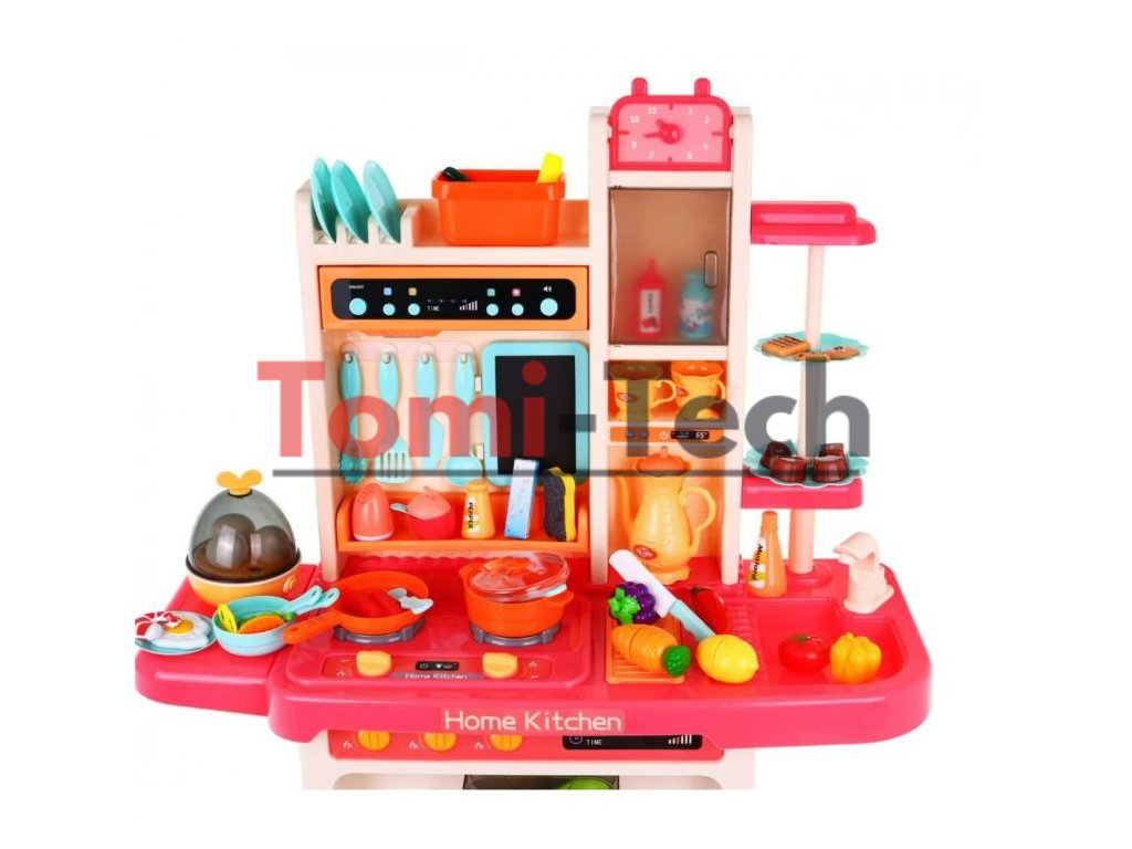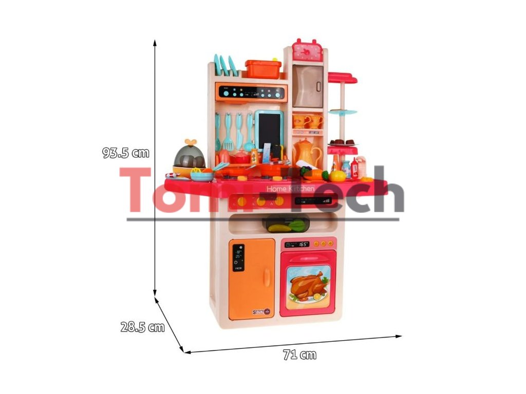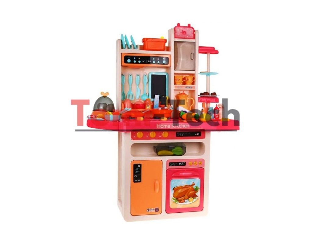 Multifunkčná detská kuchynka s vybavením . Kuchynka má drez, ku ktorému je možné pripojiť tečúca voda, osvetlené horáky so zvukmi varenia a vyprážania a otočné gombíky. Detská kuchynka má hudobný panel a otváraciu rúru a obsahuje množstvo doplnkov, potravín a riadu.V kuchynke sa tiež nachádza varič vajec, ktorý vydáva zvuky. Za horákom visí kriedová tabuľa, kde si dieťa môže písať svoje recepty.