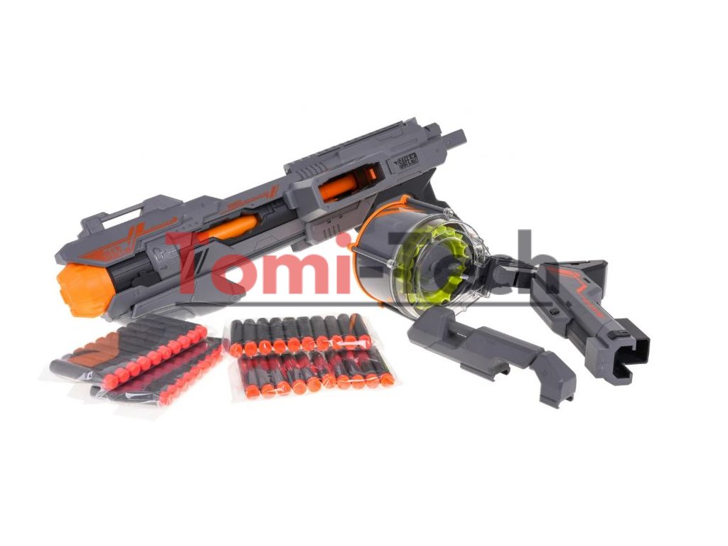 Detská pištoľ na penové náboje má zásobník, ktorý pojme maximálne 22 nábojov. Po nabití zásobníka stačí ručne napadnúť pružinový mechanizmus a stlačiť spúšť. Pištoľ má pažbu, ktorú je možné vybrať.Náboje sú vyrobené z mäkkého materiálu, takže sú pre deti bezpečné. V balení sa nachádza 20 nábojov s gumovou koncovkou a 20 nábojov s prísavkou .Hračka je vhodná pre deti od 8 rokov.Hračka nevyžaduje použitie batérií.