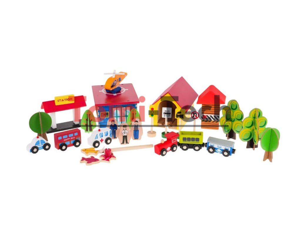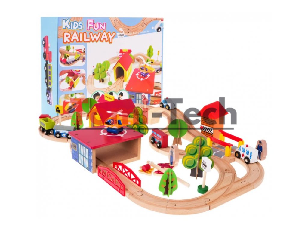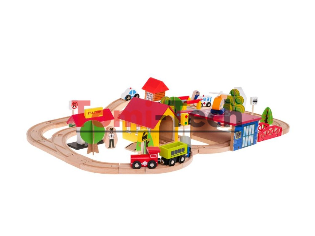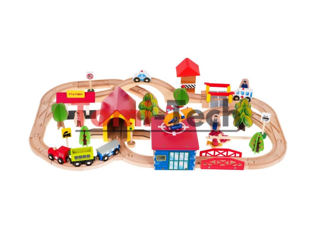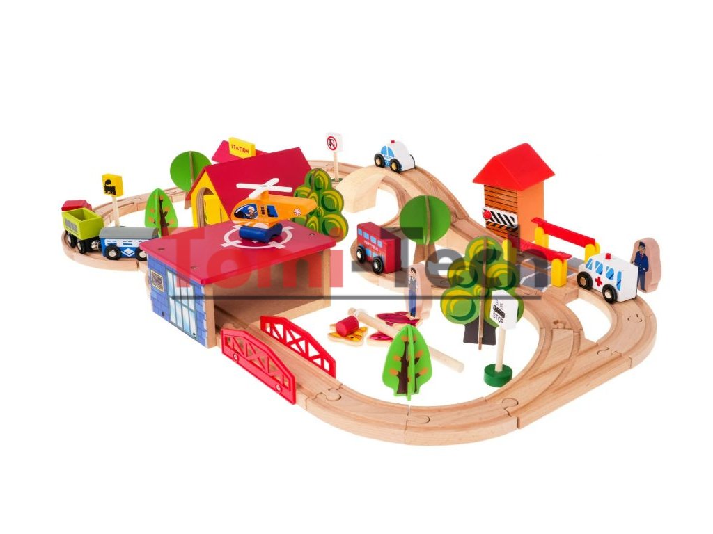 Sada obsahuje 69 prvkov vrátane zložitých tvarov koľají, výhybiek, mostov, budov, železnice a dokonca aj pristávaciu plochu pre helikoptéru. Súprava je vyrobená z dreva a natretá bezpečnými, netoxickými farbami.