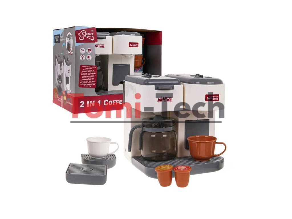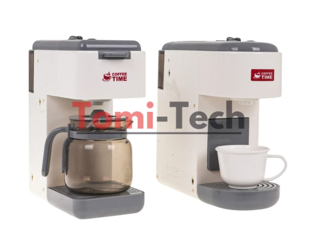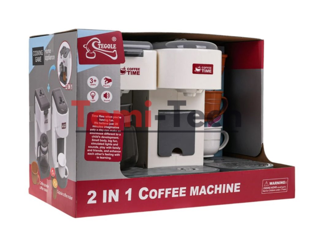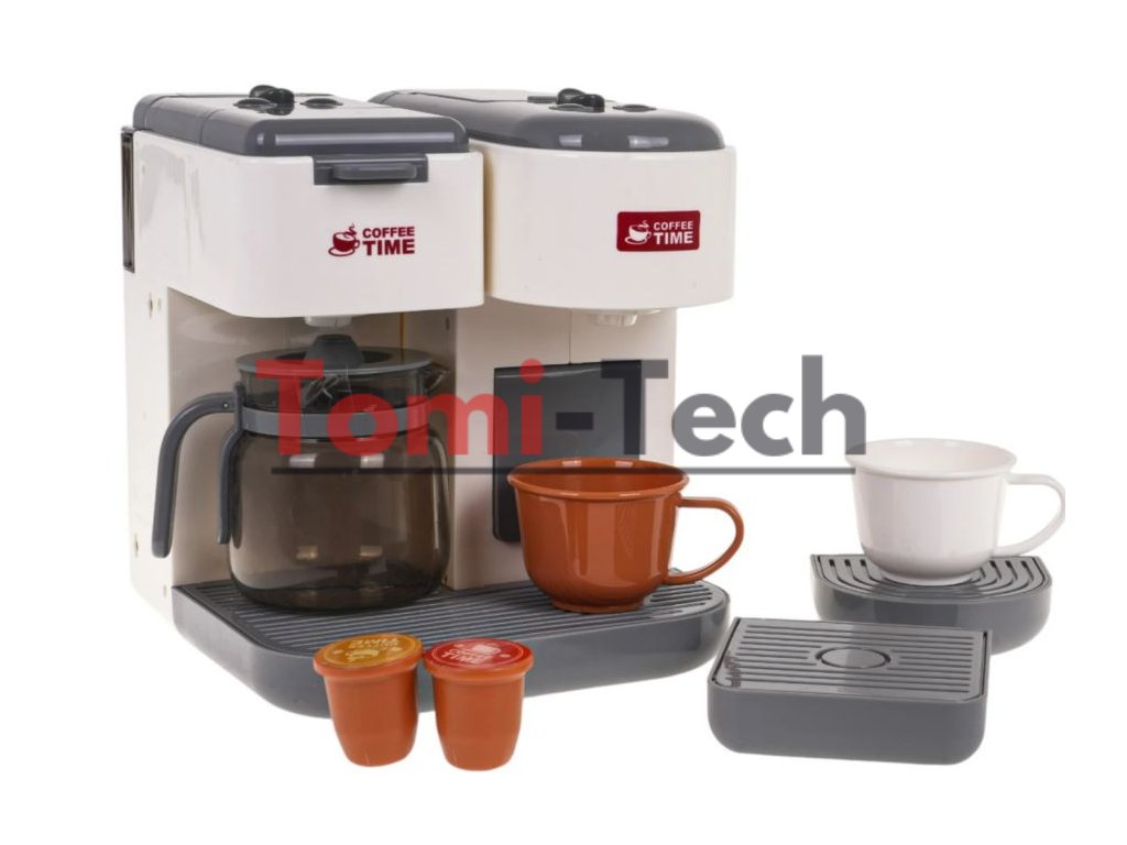Interaktívna sada 2v1 , prekvapkávací kávovar s kapsulovým kávovarom a príslušenstvom pre deti od 3 rokov . Hračka kombinuje dva spotrebiče, ktoré je možné používať súčasne, alebo ich oddeliť a hrať sa s nimi samostatne. Prekvapkávací kávovar má otváraciu zásuvku na kávu, otváraciu nádobu na vodu a 3 tlačidlá: na uvarenie malej kávy, veľkej kávy a tlačidlo na aktiváciu funkcie vody. Počas varenia kávy je počuť zvuk a bliká červená kontrolka pri vývode vody. Kapsulový kávovar má otvárateľnú nádobu na kapsule, nádobu na vodu a tlačidlá na prípravu malej a veľkej kávy. Počas varenia je rovnako ako pri kávovare počuť zvuk varenia a bliká červené svetlo na výstupe vody.