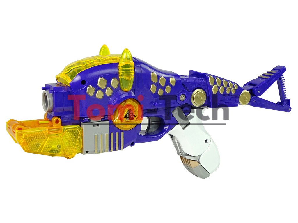 Šípková pištoľ má intenzívnu fialovú farbu a dlhý dosah. Pištoľ sa dá premeniť na obrovského Triceratopsa, fanúšik dinosaura sa môže zmeniť na komando a začať zábavu odznova. Štít, ktorý je súčasťou súpravy, vám umožní precvičiť si cieľ a zbierať body. Začnite súťažiť so svojimi rovesníkmi a uvidíte, kto má lepší cieľ!