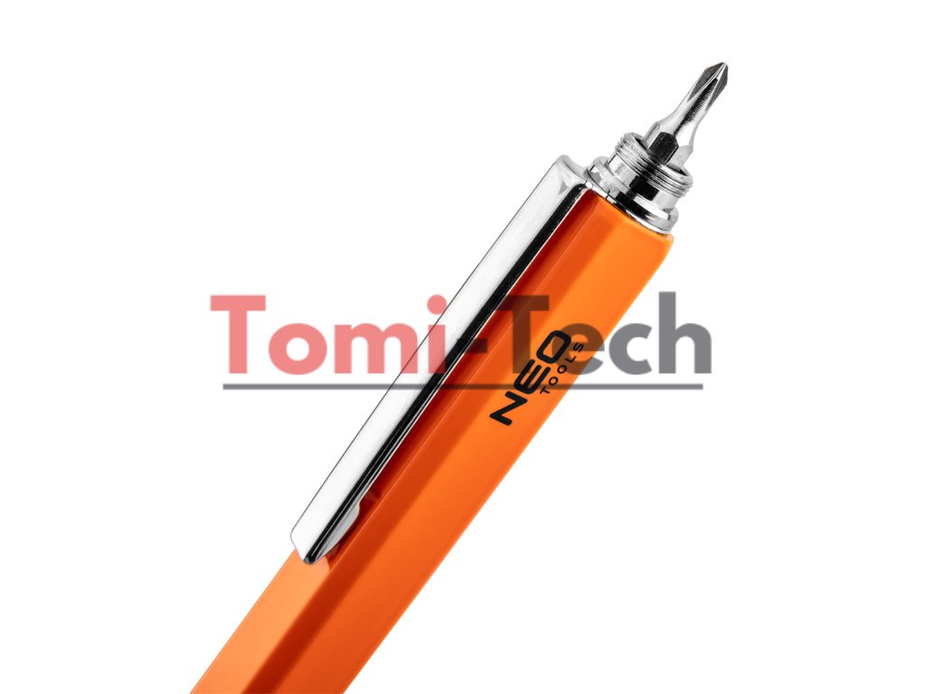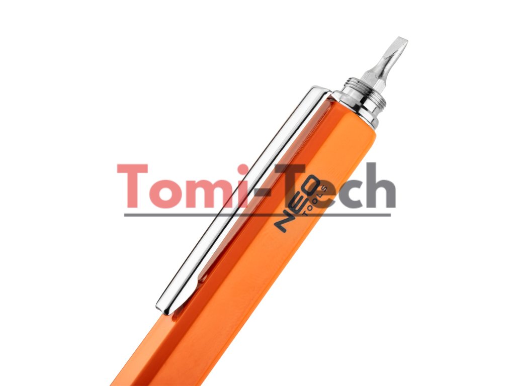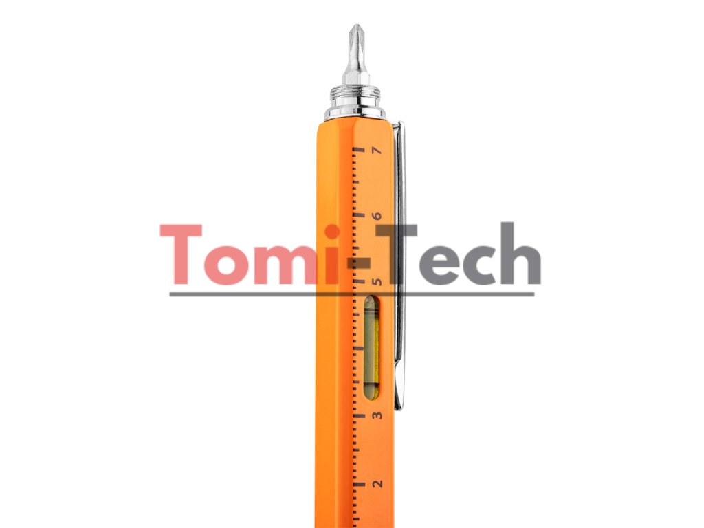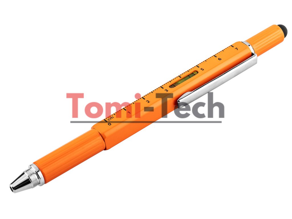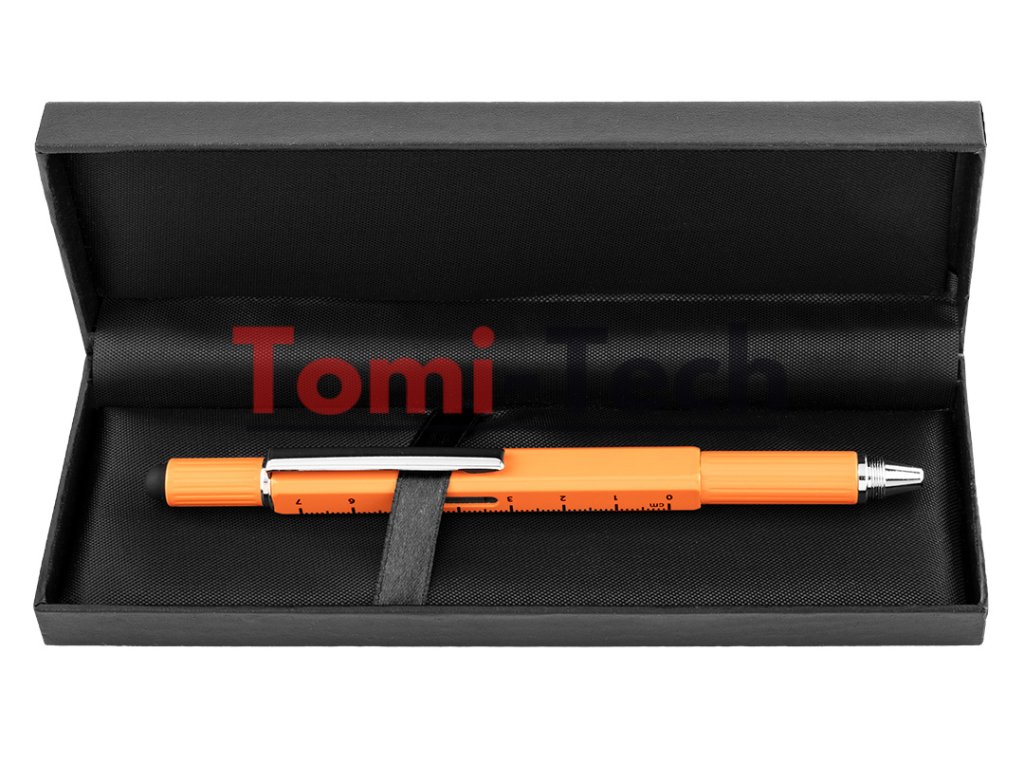 Kovové pero 5 v 1, funkcie: guľôčkové pero s modrým atramentom, pravítko, vodováha, stylus, skrutkovač (plochý a krížový), oranžová farba, balené v čiernom puzdreDodatočné parametre