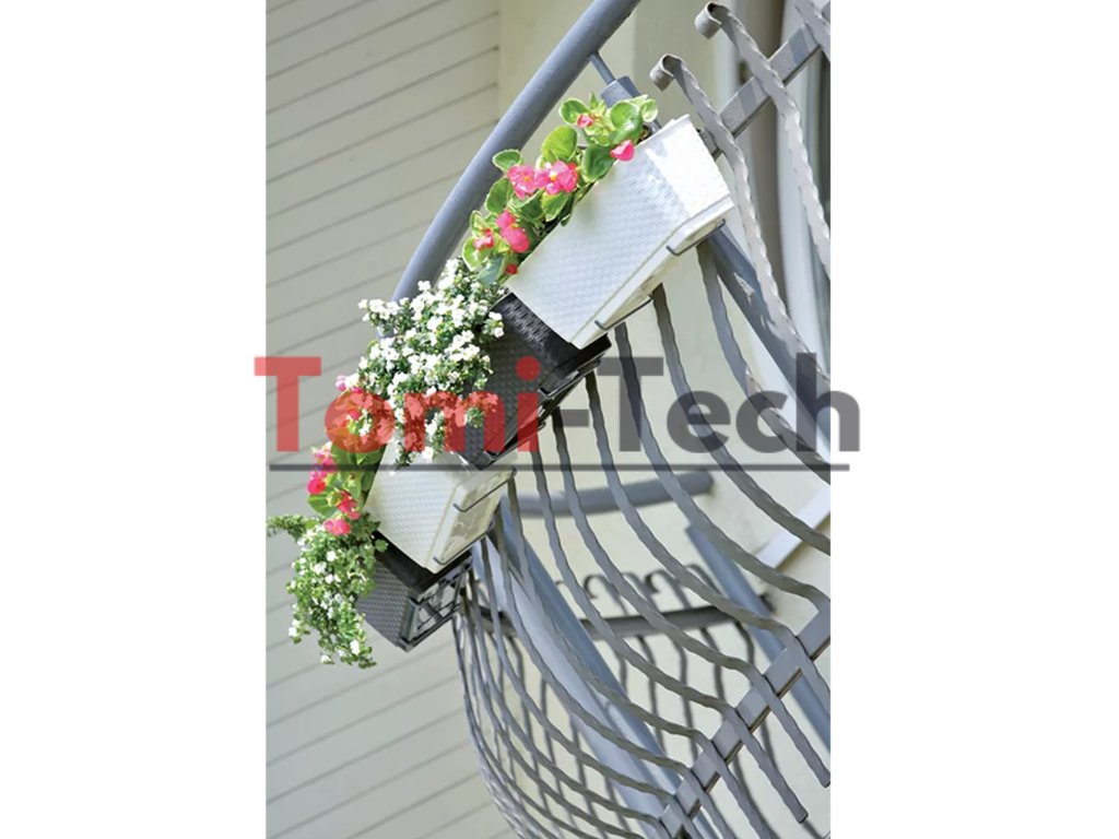 Obdĺžnikový kvetináč s textúrou imitujúcou ratanový výplet. Vybavený samomontážnymi háčikmi na zábradlie a praktickou dištančnou podložkou pre správne zavlažovanie rastlín. Dištančná podložka predlžuje dobu, počas ktorej pôda zostane vlhká. Umožňuje tiež šetriť vodu vďaka zníženému odparovaniu.