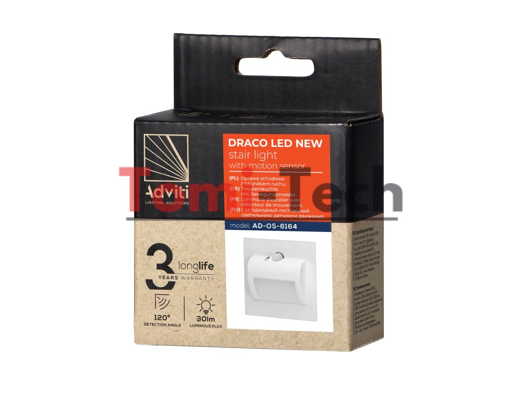 DRACO LED NEW 1,5W, zapustené schodiskové svietidlo, 12VDC, 30lm, 4000K, biele, senzor pohybu a súmrakuDodatočné parametre