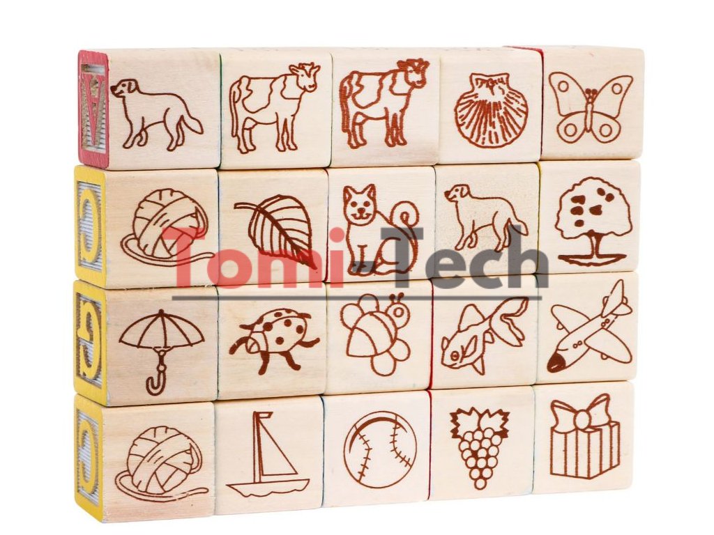 - 20 drevených kociek s obrázkami a písmenami abecedy